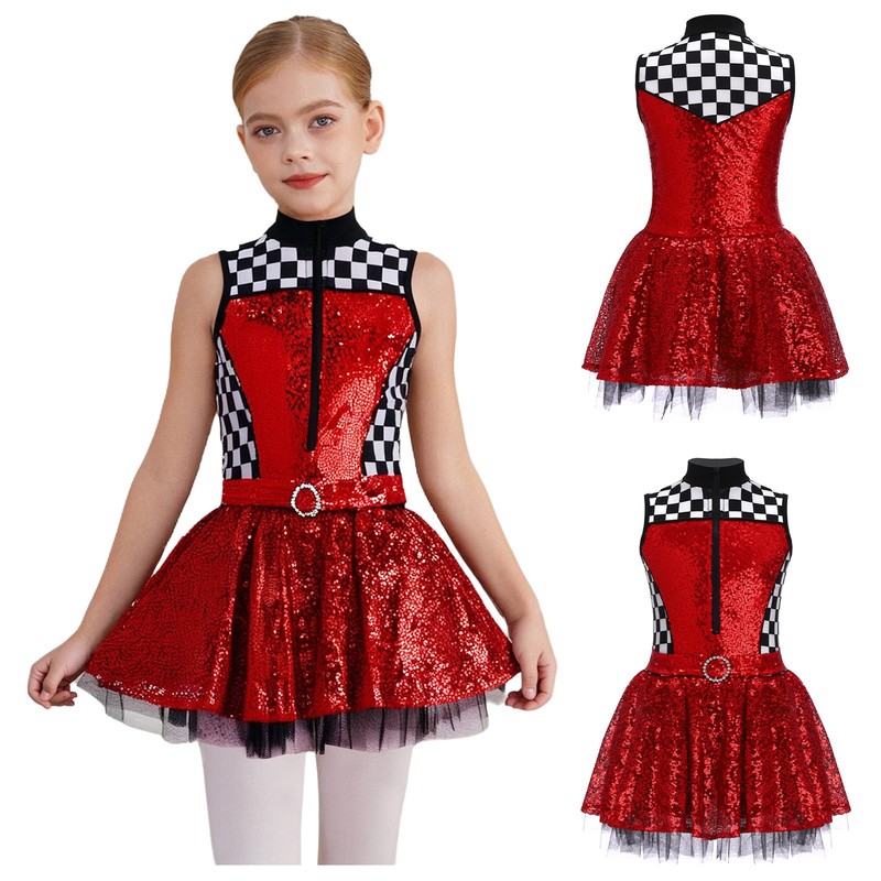 The waist ring detail not only accentuates the waistline creating a flattering silhouette for young girls but also adds a touch of elegance to the overall racing - themed outfit.