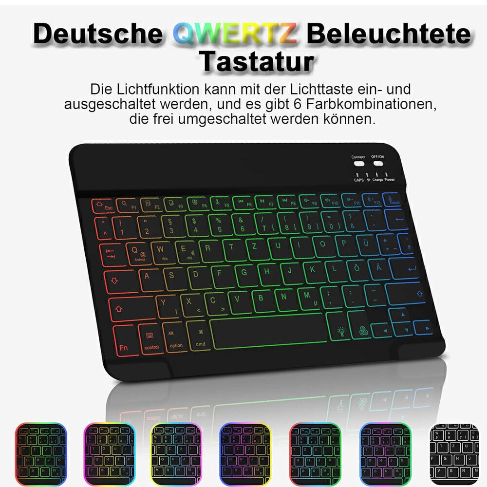 【 3-Zonen 7-Farben-Hintergrundbeleuchtung & Abnehmbare Tastatur】- Tastatur mit Hintergrundbeleuchtung, 3 Zonen + 7-Farben-Hintergrundbeleuchtung mit 3 Helligkeitsstufen einstellbar. Praktisch für Tastaturbedienungen bei schwachem Licht, um Ihnen einen anderen visuellen Genuss und angenehmes Tipperlebnis. 2 en 1 Design mit Tastatur und Lederhülle für Samsung Tab. Die Tastatur und das Gehäuse können getrennt werden, um sie an unterschiedliche Verwendungen und Umgebungen anzupassen
