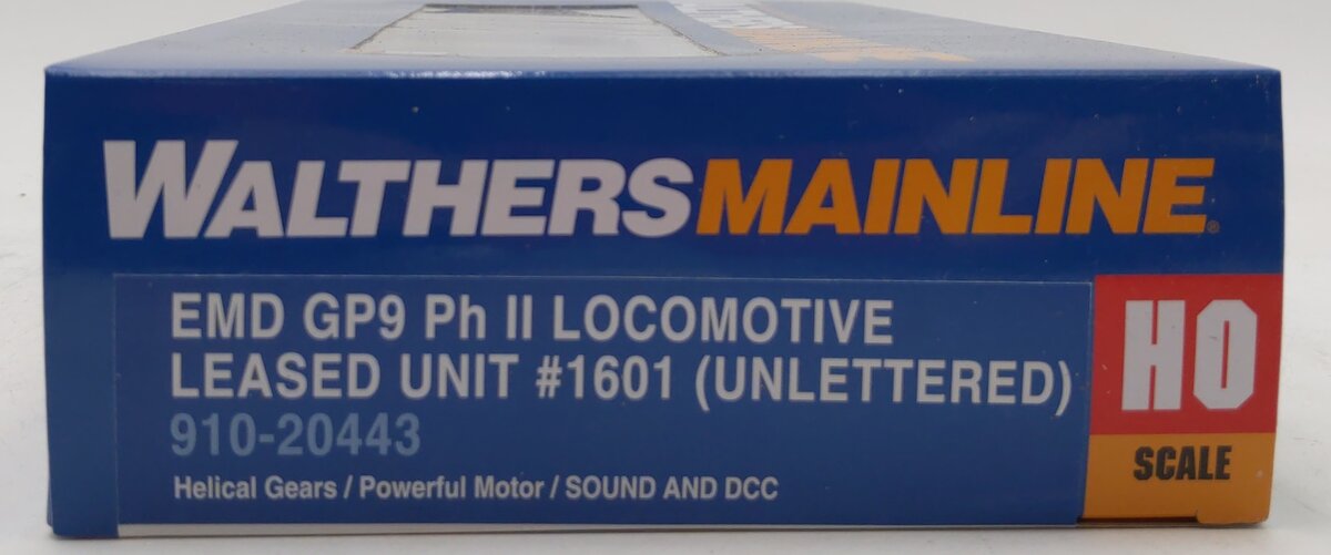 This is a Walthers 910-20443 HO Scale Leased Unit EMD GP9 Phase II Diesel Locomotive with Chopped Nose ESU(R) Sound & DCC #1607. WalthersMainline Phase II Chopped Nose GP9 is a must-have model for your 1960s and later diesel roster! Outwardly similar to the earlier GP7, and sharing the same boxy, no frills body with its high, short hood, minor production changes in the number and placement of louvers on locomotives built from 1955 to 1957 resulted in what modelers and railfans refer to as phase two GP9s. In the 1960s, many roads began rebuilding their GP9s as an affordable alternative to new equipment, and many were refitted with chopped short hoods to improve forward visibility. Like it's prototypes, many are still going strong today and the WalthersMainline Phase II GP9 with chopped nose is perfect power for any assignment and features: One time run of these roadnumbers - order now, limiyted quantity available! Detailed body with chopped nose, Based on Phase II units rebuilt in the 1960s by many owners, Scale width hood with correct contours, With or without dynamic brakes as appropriate, See-through steps, Correct RP-25 metal wheels, Available with ESU Sound and DCC for DCC or DC layouts featuring: 4 function outputs with brightness control by CV, Fully DCC compatible, 14, 28 or 128 speed steps, Dual mode DC and DCC, 4 Airhorns changeable by CVs, 2 bells changeable by CVs, Full 8-notch prime mover sounds, Compressor, Dynamic brake. Same powerful drive as WalthersProto(R) locos featuring: Five-pole skew-wound motor 14 to 1 gear ratio, Helical-cut gears for quiet operation and easy multiple unit operation, All-wheel drive and electrical pickup, Machined brass flywheel, Heavy die-cast metal chassis, Constant and directional LED headlights, 21-pin DCC plug, Molded drill starter points - add grab irons to your model easily with the GP9 Phase II Diesel Detail Kit (#910-258 sold separately).
