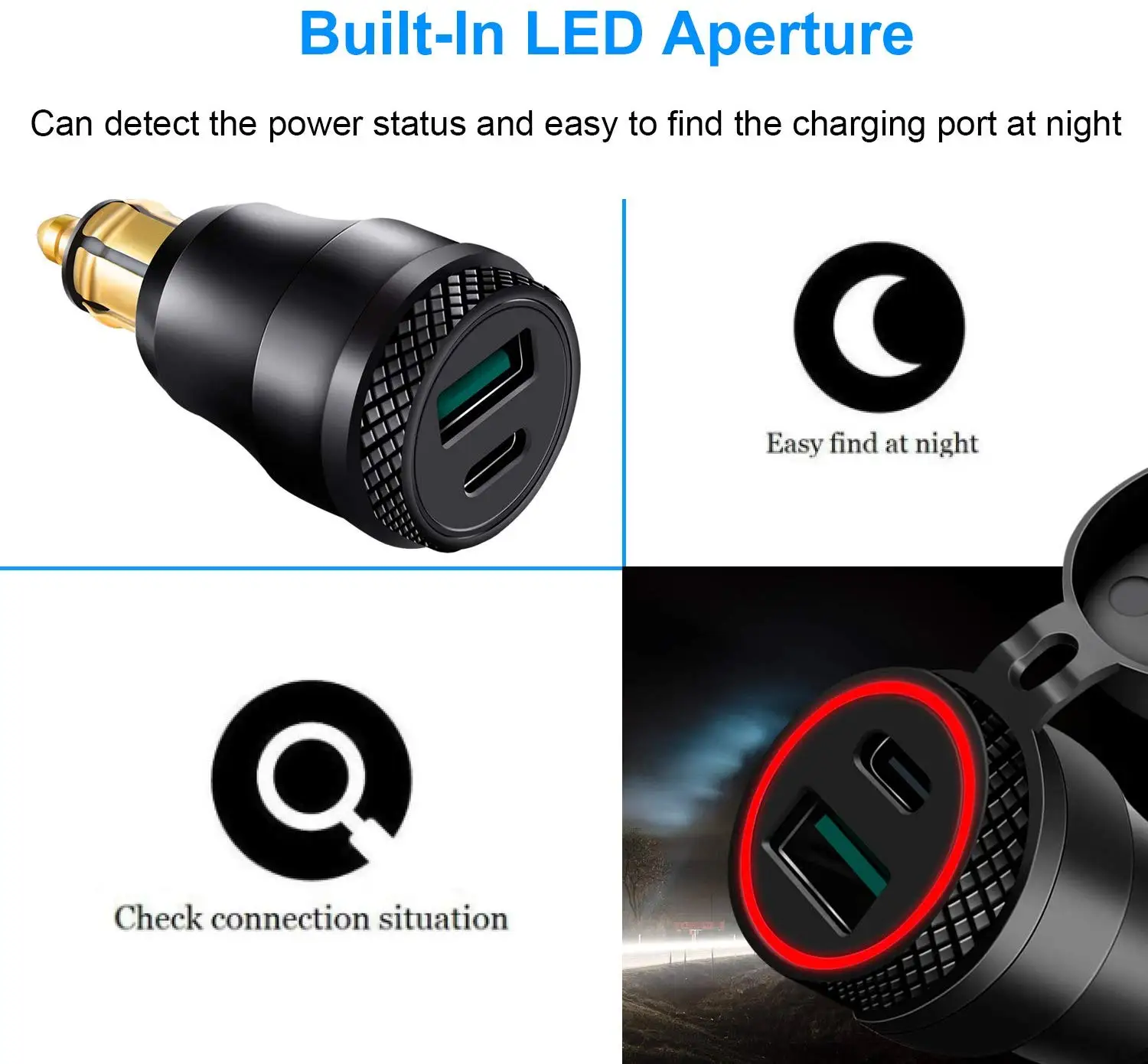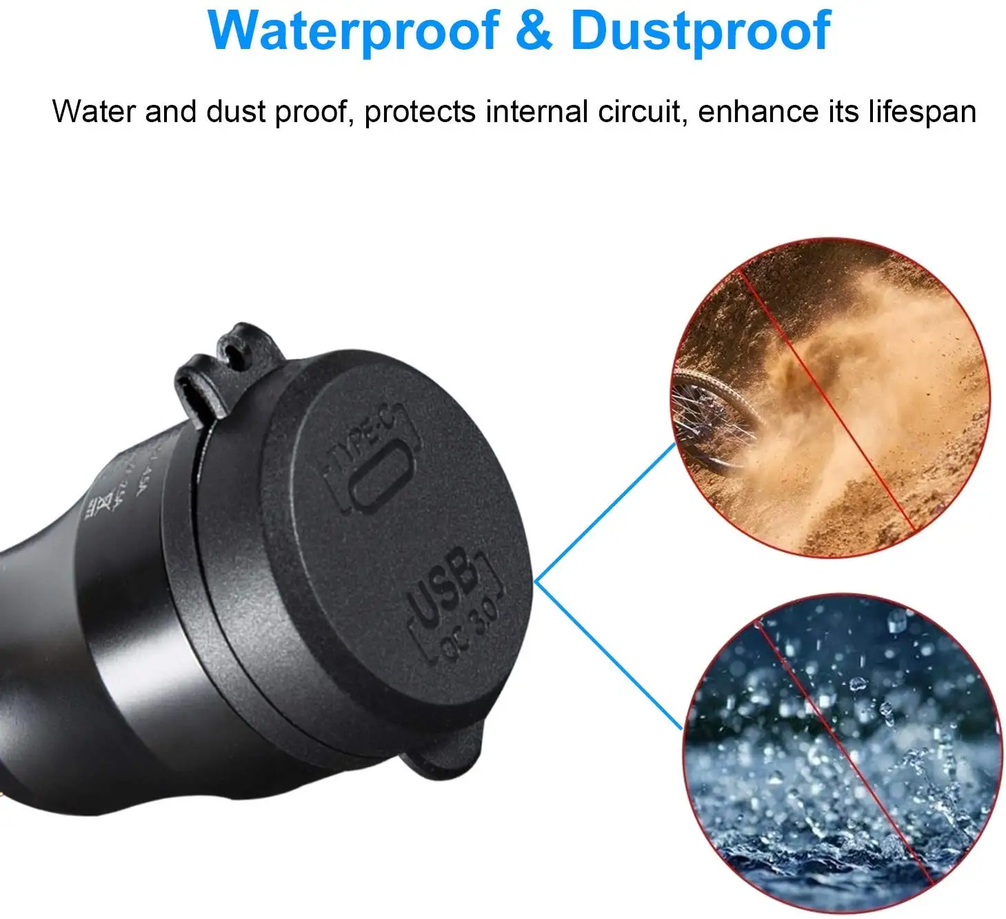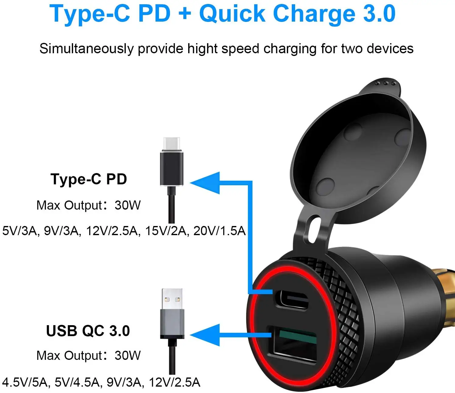 --- Quick Charge 3.0 (QC 3.0) through USB to provide 5A (max) for Huawei/other android phones supporting QC protocol, 4 times faster charging speed than conventional motorcycle usb chargers, 38% faster than QC 2.0.