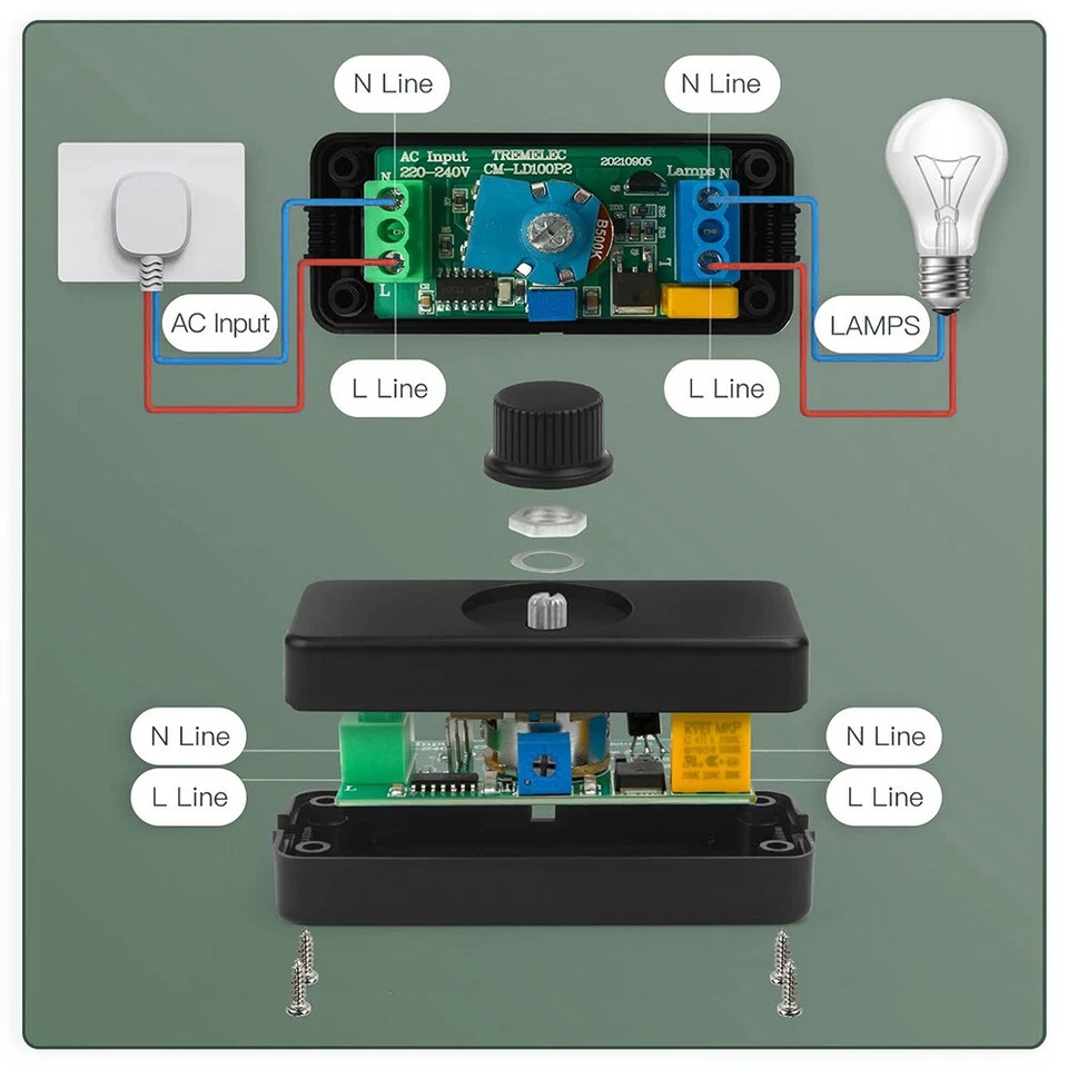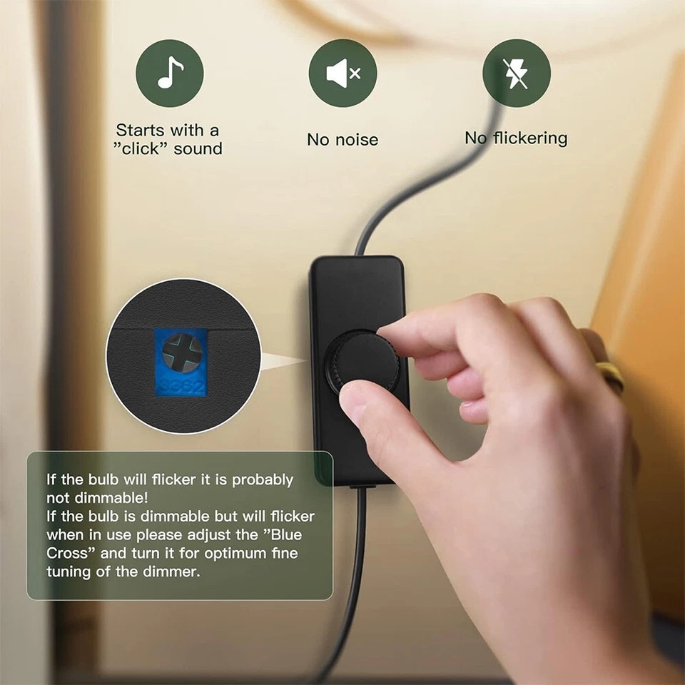 Technical advantage. 220~240Vac 3-100W inline trailing edge phase-cut dimmer, the dimming process is completely silent and will not make a buzzing sound