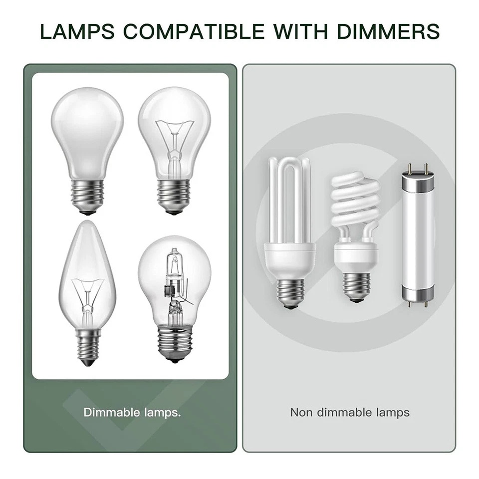 Energy savings. Works with max 50 Watts of dimmable LED Bulbs or 100 Watts of Incandescent/Halogen Bulbs, Dimming range 0 - 100% to cut energy costs and extend bulb life.