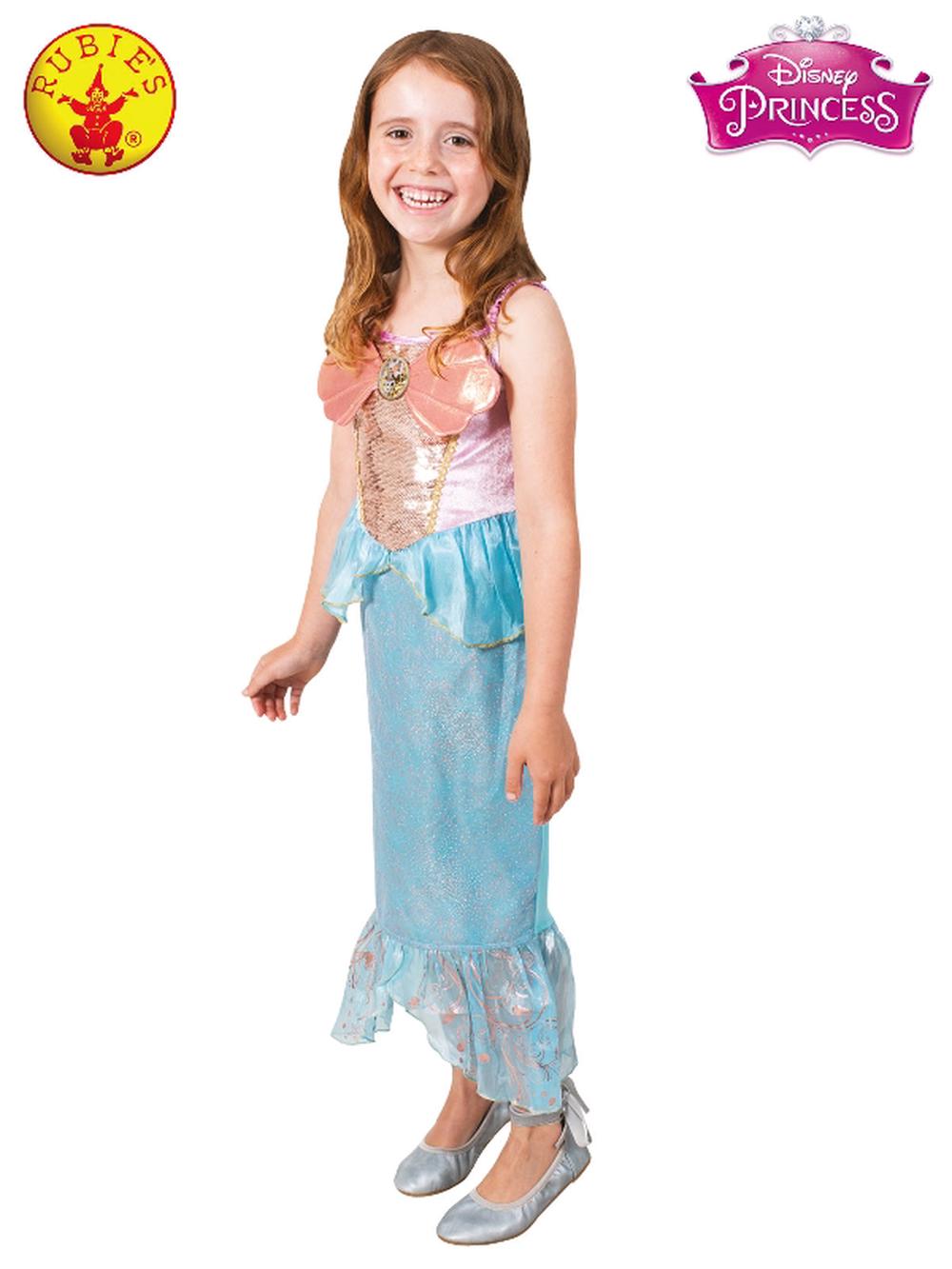 Description Affectionately known as the Little Mermaid, this Disney Princess of the Sea and star of the 1989 movie is known for her long flowing red hair and adventurous ways. Daughter of King Triton, the mischievous Ariel always tested the boundaries of right and wrong, with her well-intentioned friends Sebastian and Flounder. With the wicked Ursula on her tail, having stolen her magical singing voice, it will take more than a dinglehopper at the bottom of the ocean, to find her Prince Eric. INCLUDES * Exquisite dress with a gold foil velour bodice and featuring a gold sequin centre panel. Irridescent copper gold metallic shell bodice detail * Shell neckline has a character pendant at the centre * Organza peplum at waist with gold trim embellishments * Pencil-style organza top skirt with a soft net layer featuring all-over foil dot print and glitter screen print * Flowing Satin "tail" with gold foil screen print * Shoes not included * This is an officially licensed Disney product