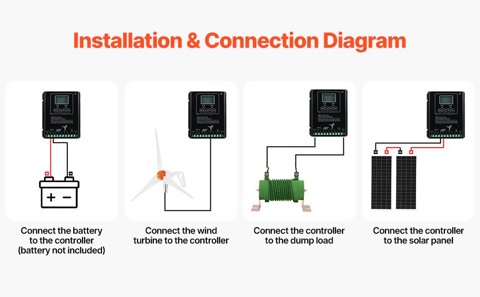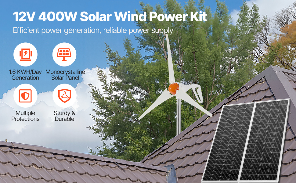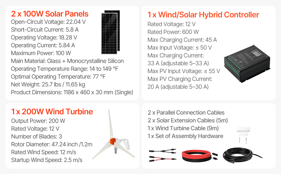 Facile da installare. Include 2 pannelli solari da 100 W, 1 turbina eolica da 200 W, 1 controller ibrido eolico/solare MPPT, 2 cavi di collegamento parallelo, 2 cavi di prolunga solari (5 m), 1 cavo per turbina eolica (9 m), 1 set di accessori di montaggio.