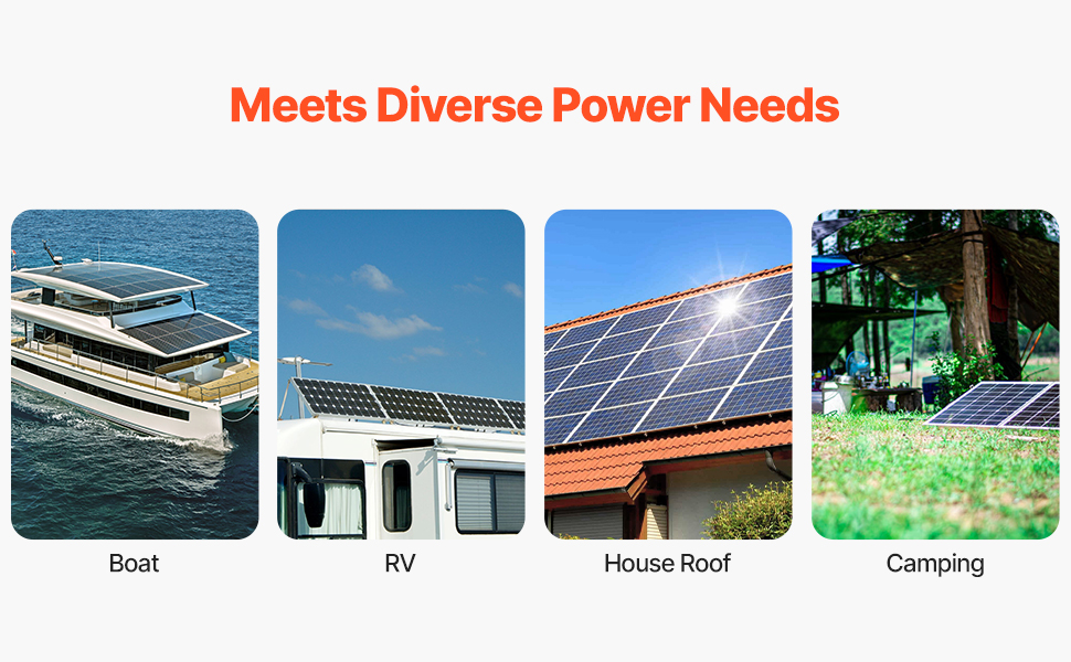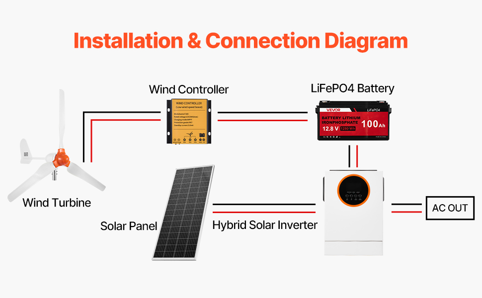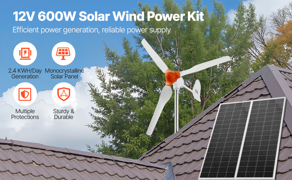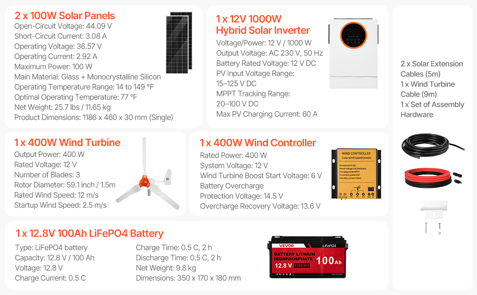 Facile da installare. Include 2 pannelli solari da 100 W, 1 turbina eolica da 400 W, 1 regolatore eolico MPPT, 1 inverter solare ibrido da 12 V 1000 W, 1 batteria LiFePO₄ da 12,8 V 100 Ah, 2 cavi di prolunga solari (5 m), 1 cavo per turbina eolica (9 m) e 1 set di accessori di montaggio.