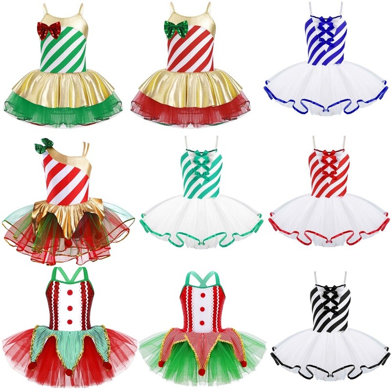 Kids Girls Christmas Striped Tutu Dress Candy Cane Costume Ice Skating Leotard