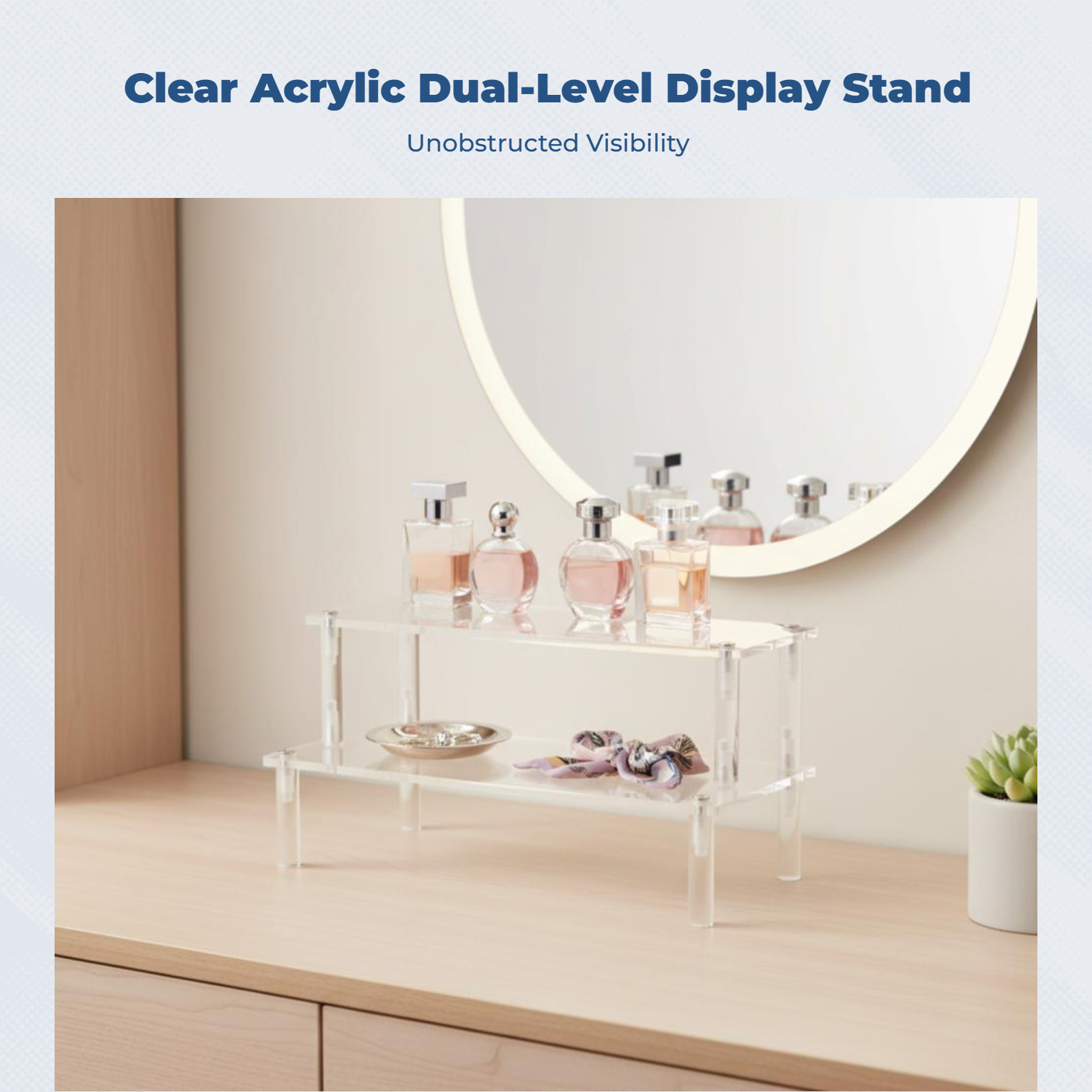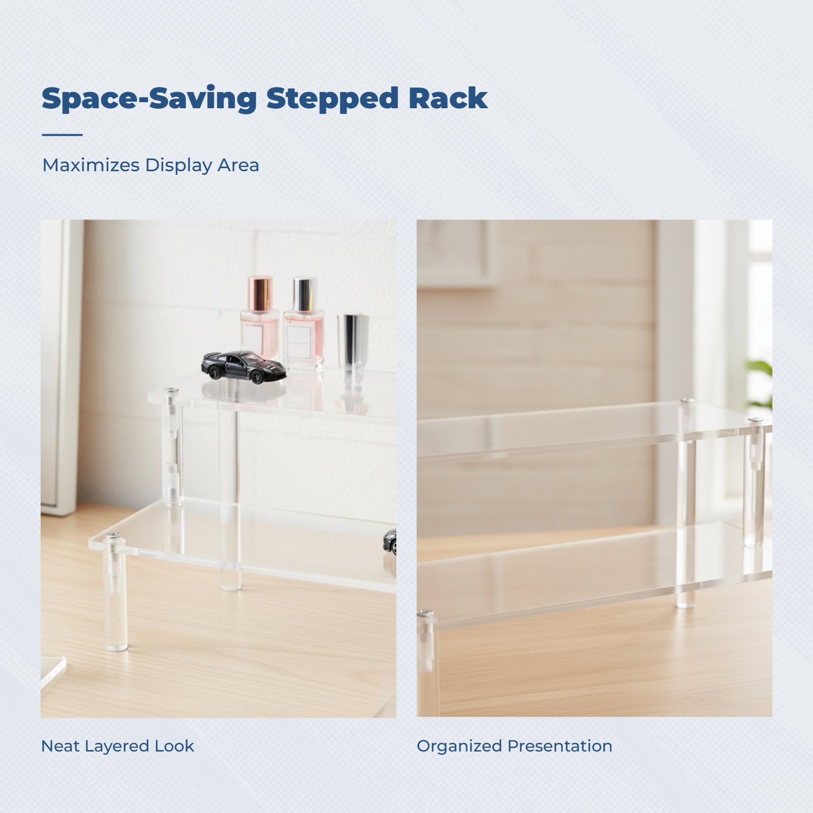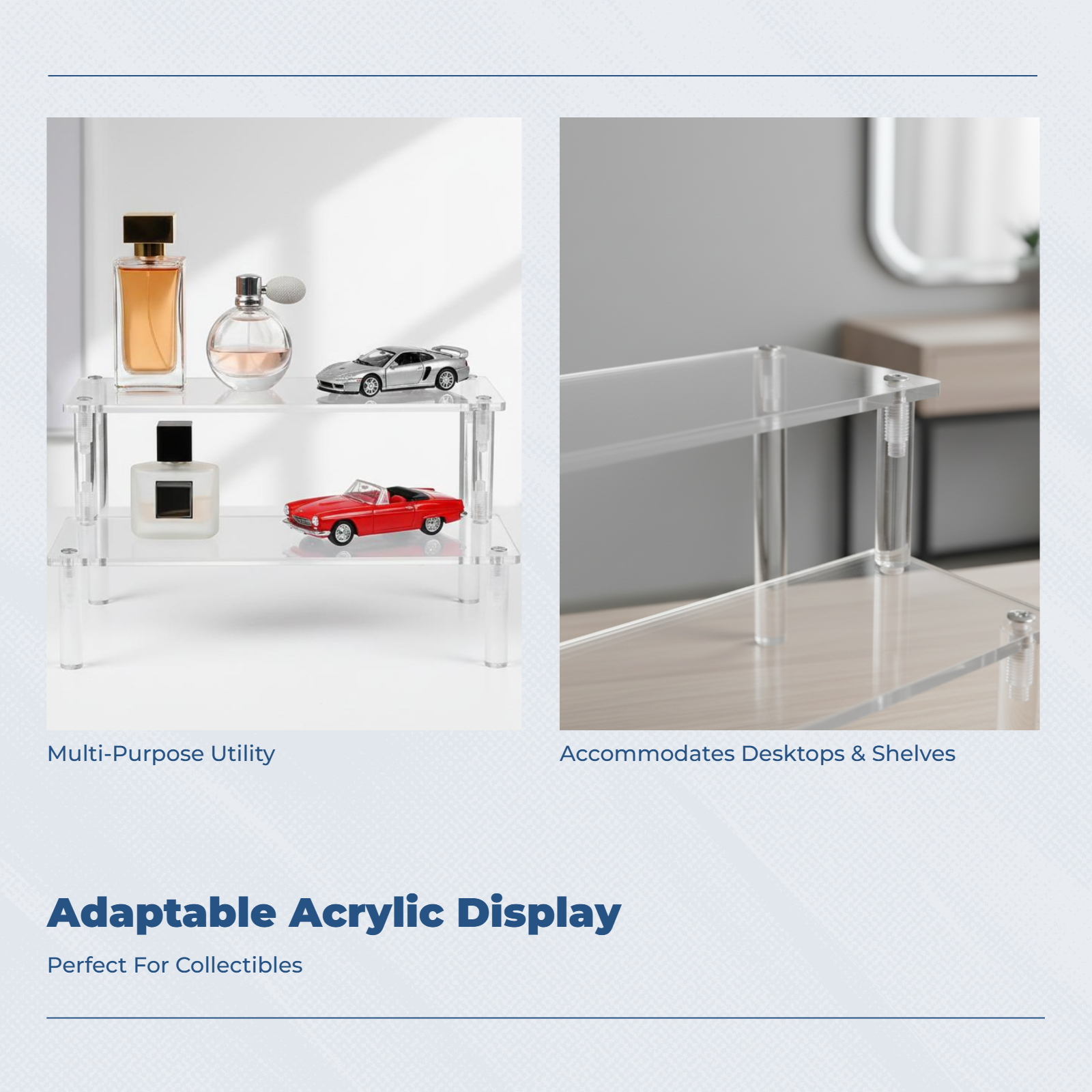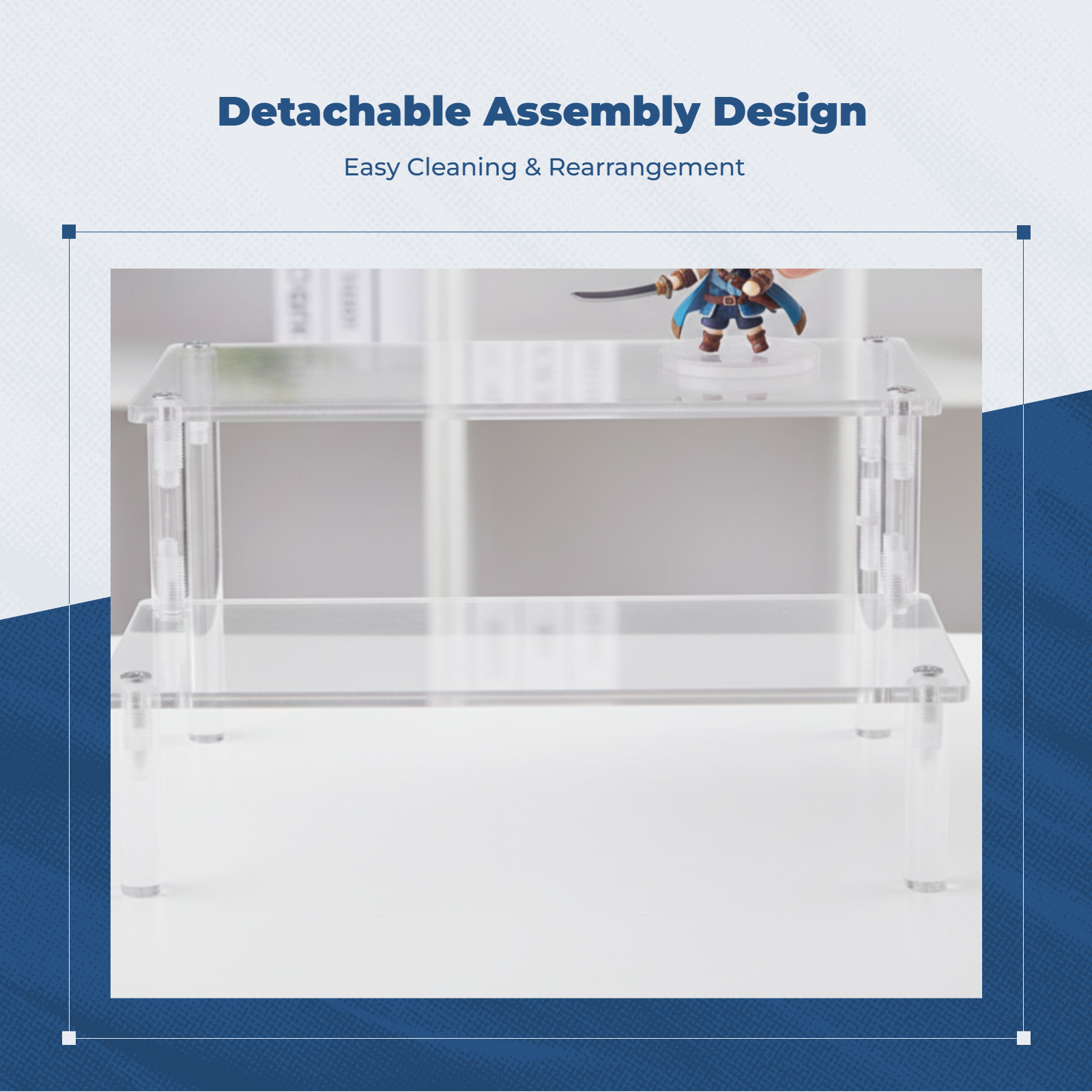 This is a 2-tier display stand designed for organizing and showcasing various items. Constructed from clear acrylic, it provides an unobstructed view of your collection. The stand features a detachable design, allowing it to be easily taken apart for storage or transport. It is suitable for use as a cosmetics storage rack or as a display stand for collectibles like model figures.