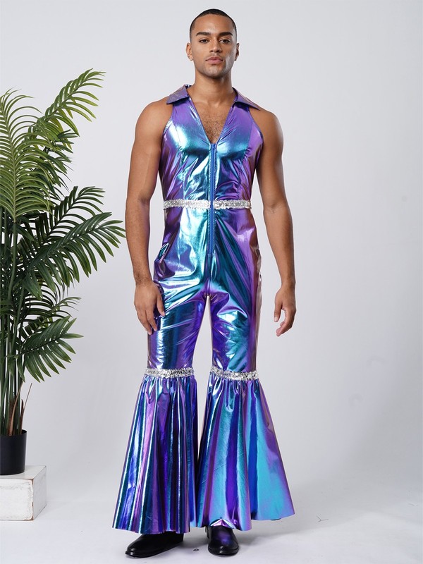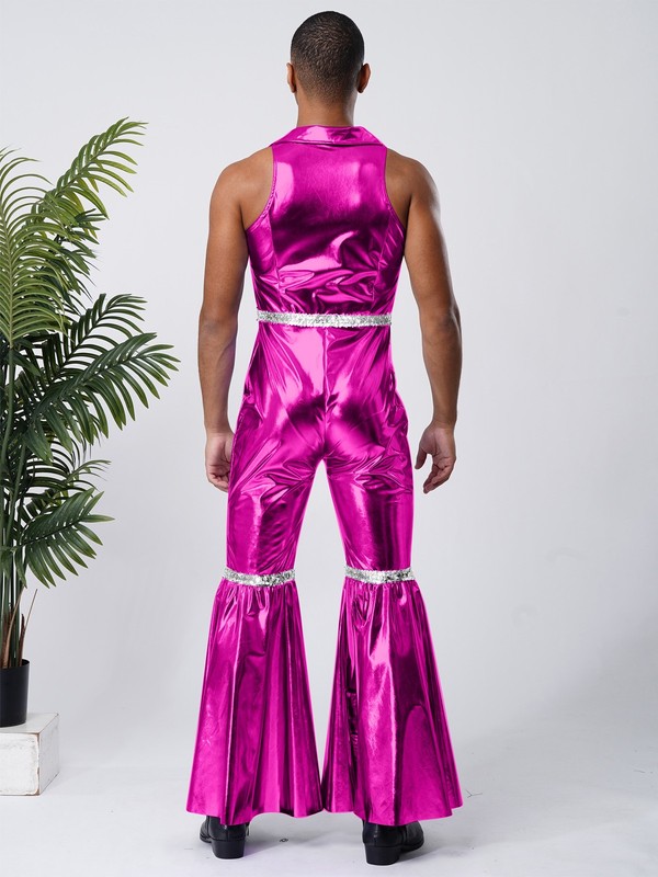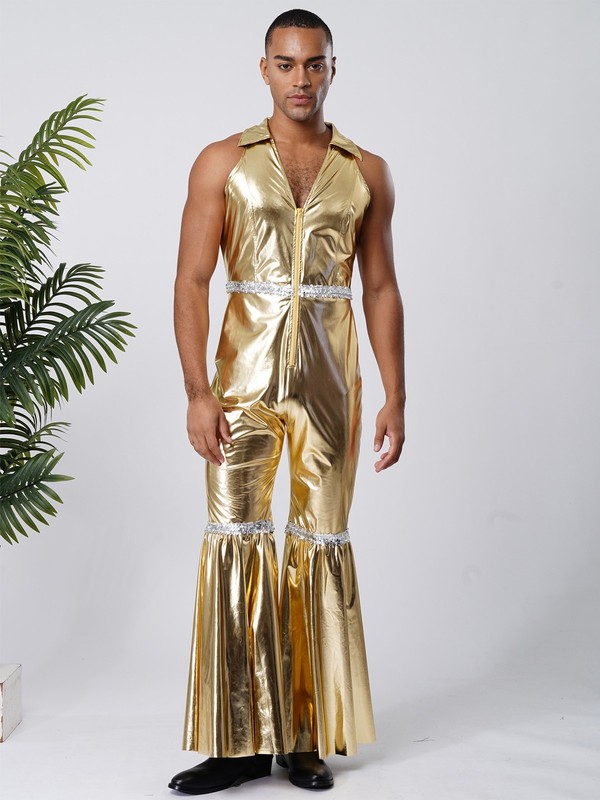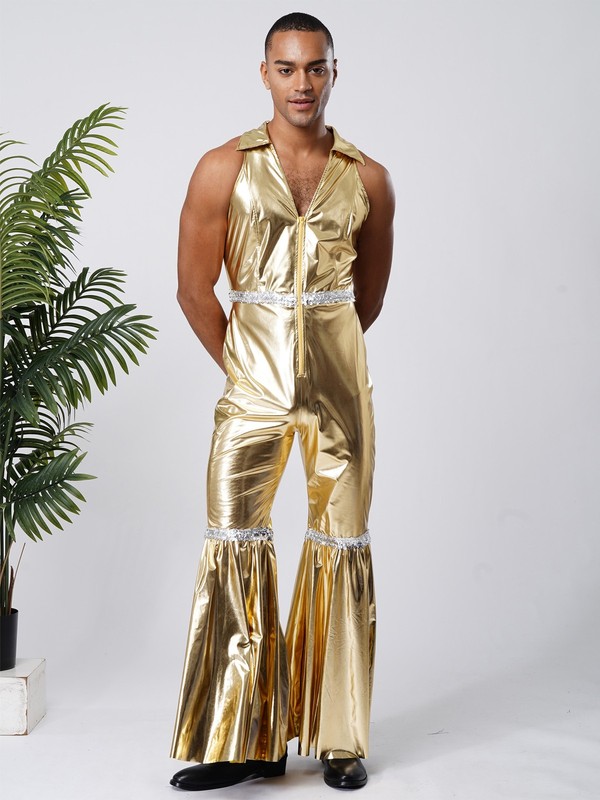 Set Include: 1Pc Men's JumpsuitCondition: New with tagsMaterial: 100% PolyesterFeatures:Crafted from high-quality polyester, the jumpsuit is lightweight and easy to move in, ensuring maximum comfort during wear.The 70s disco style is back in trend, with this jumpsuit featuring a lapel V-neck and sleeveless design, offering a trendy and retro look.Sequins adorn the waistline and the bell-bottom long pants, adding a touch of glamour and sparkle, making you the center of attention.The front zipper design not only makes it convenient to put on and take off but also adds a modern and edgy element to the overall style.Perfect for various events such as retro parties, jazz dance performances, themed nights, or any occasion where you want to make a bold fashion statement.