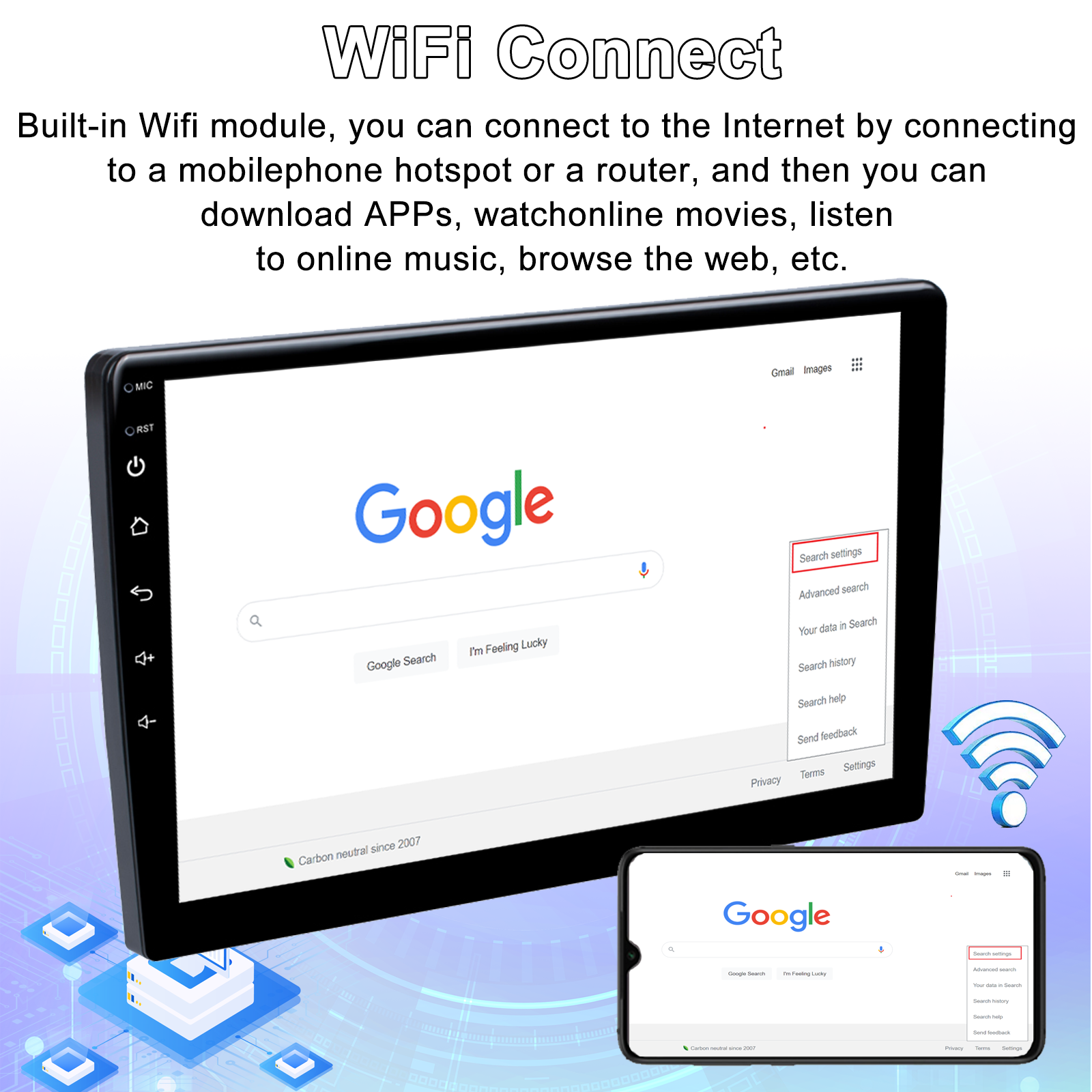 3.Wifi connect:Built-in Wifi module, can connect to internet by wifi hot spot, download APP to watch online TV, movie, chat with your firends
