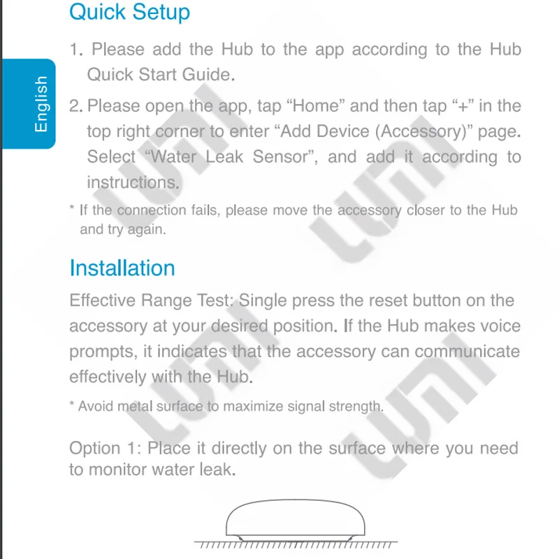 When the water level reaches up to 0.5mm, the Water Leak Sensor will trigger the Hub to sound an alarm and send a notification to your phone.