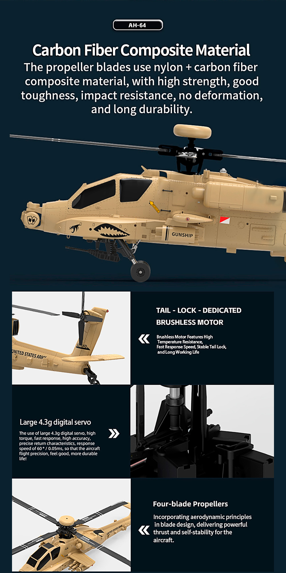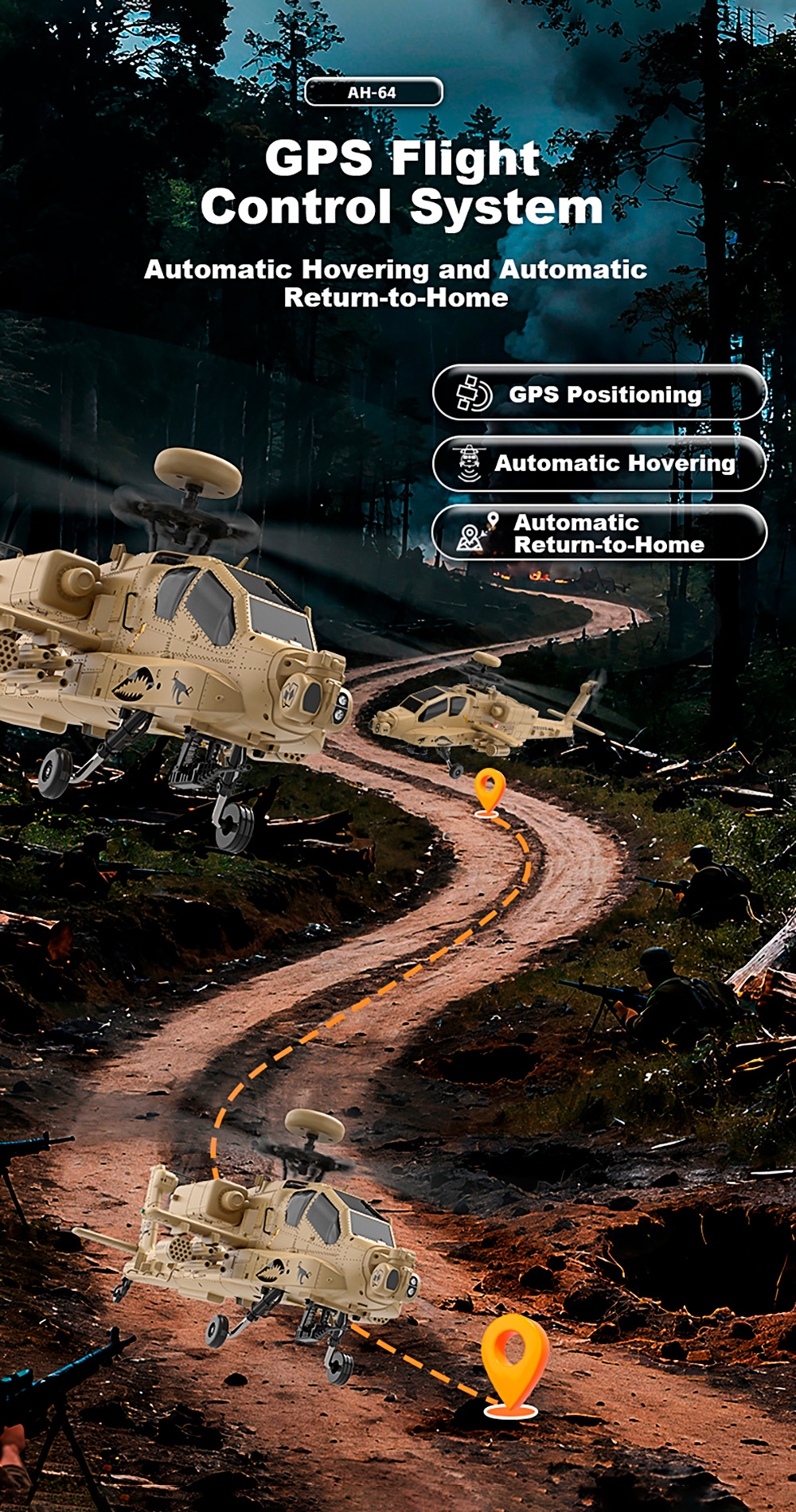 F11-H Apache AH-64D Helicopter has a multi-functional flight mode with GPS enhanced stability, visual flight, manual self stabilization mode, and one key return, low power intelligent return, loss of control return, one key landing, electronic fence, one key 8-shaped route flight, one key circular flight, and other safe flight functions.