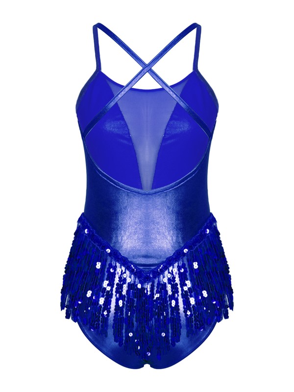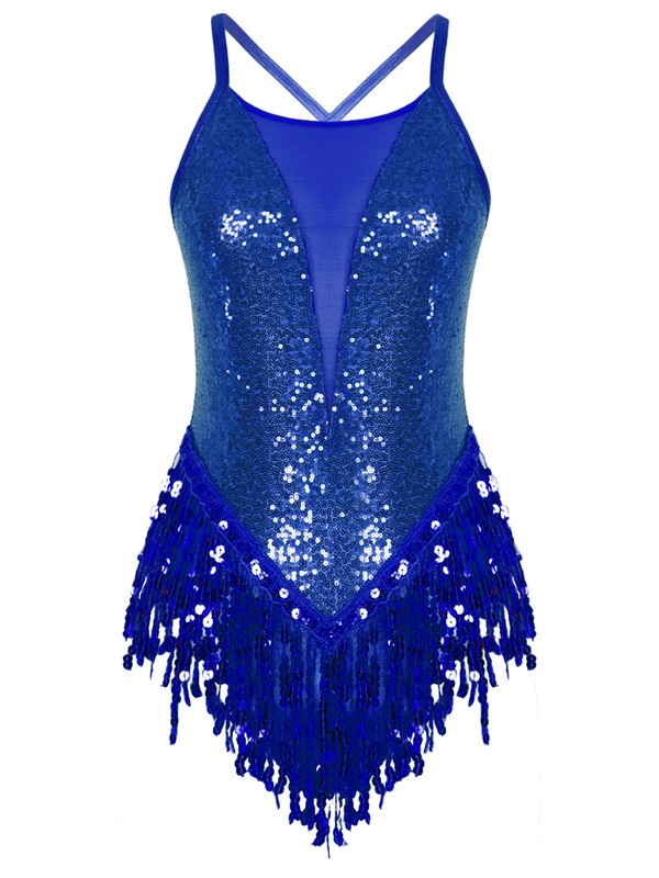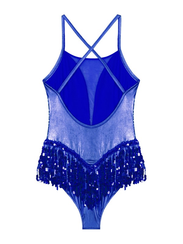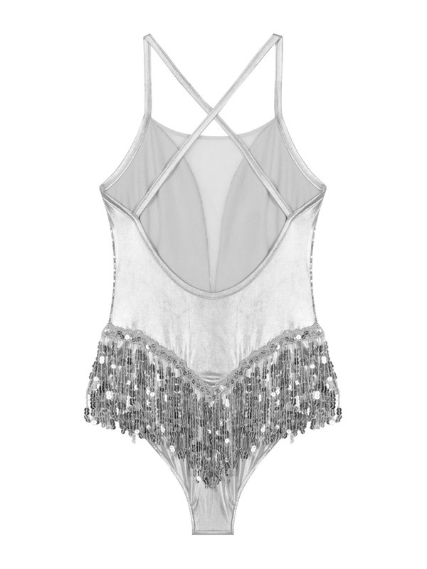 Womens Sparkling Sequins Fringed Leotard Cross Back Bodysuit Dancewear.