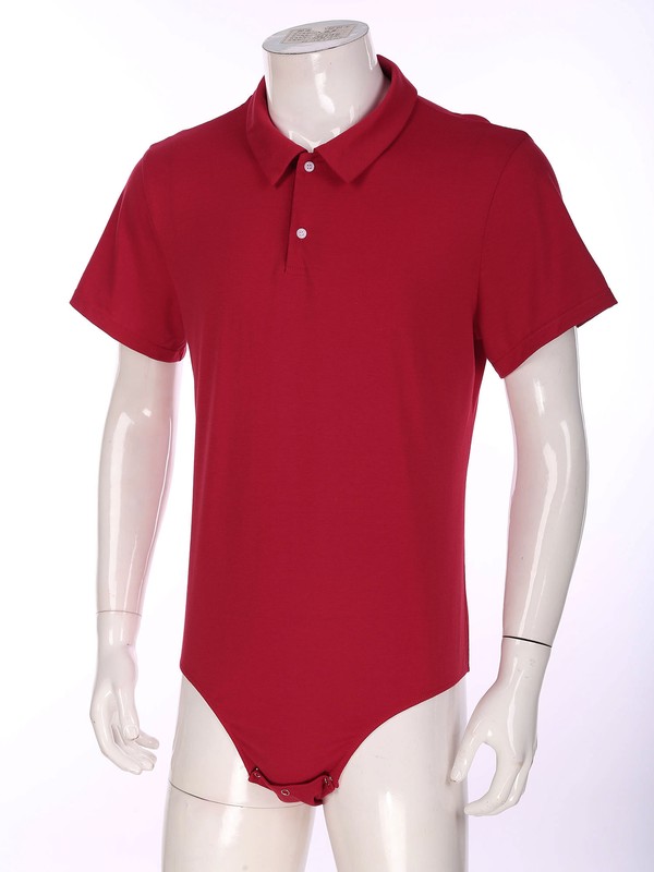 Short sleeves, turn-down collar with two fasteners, men’s shirt design bodysuit, solid color.