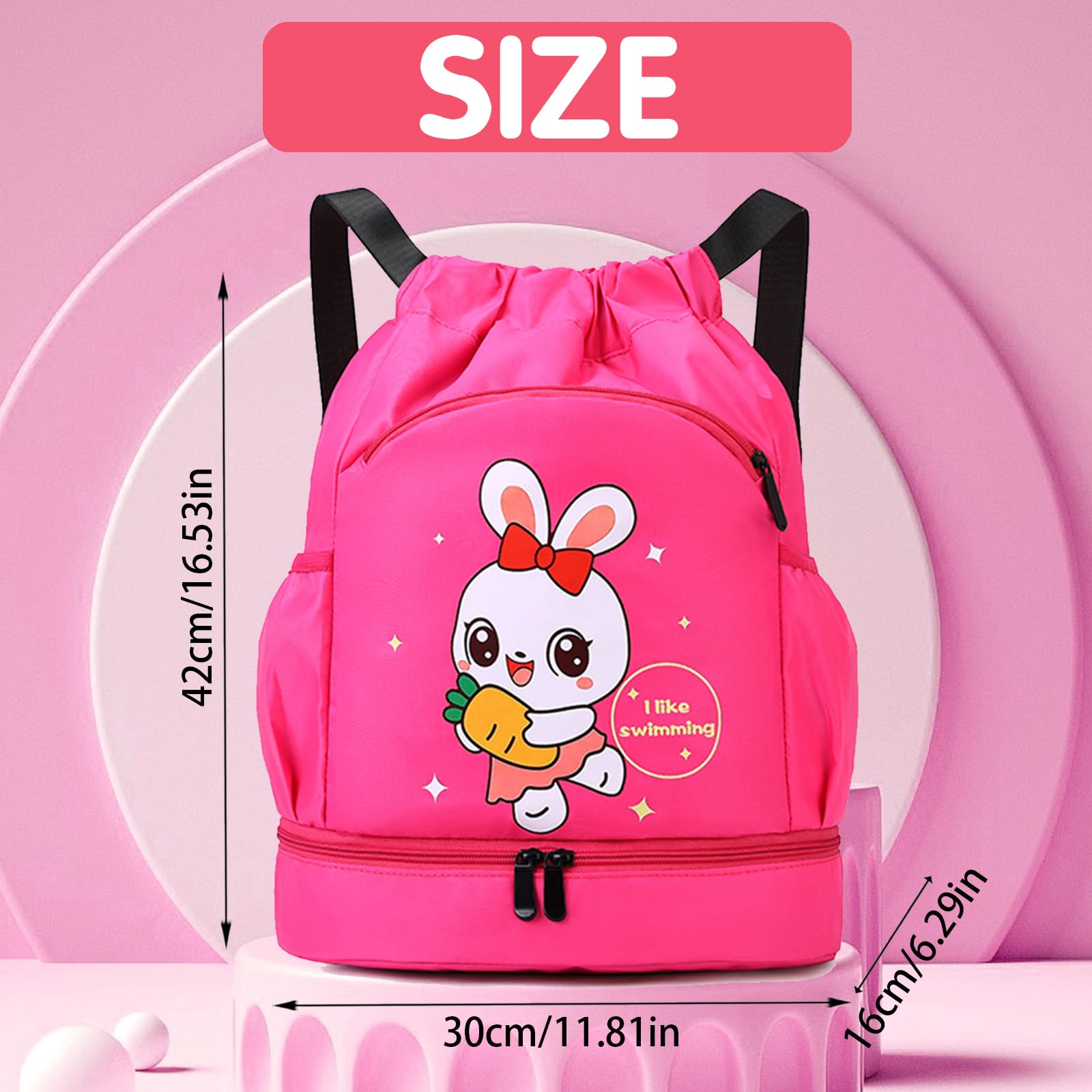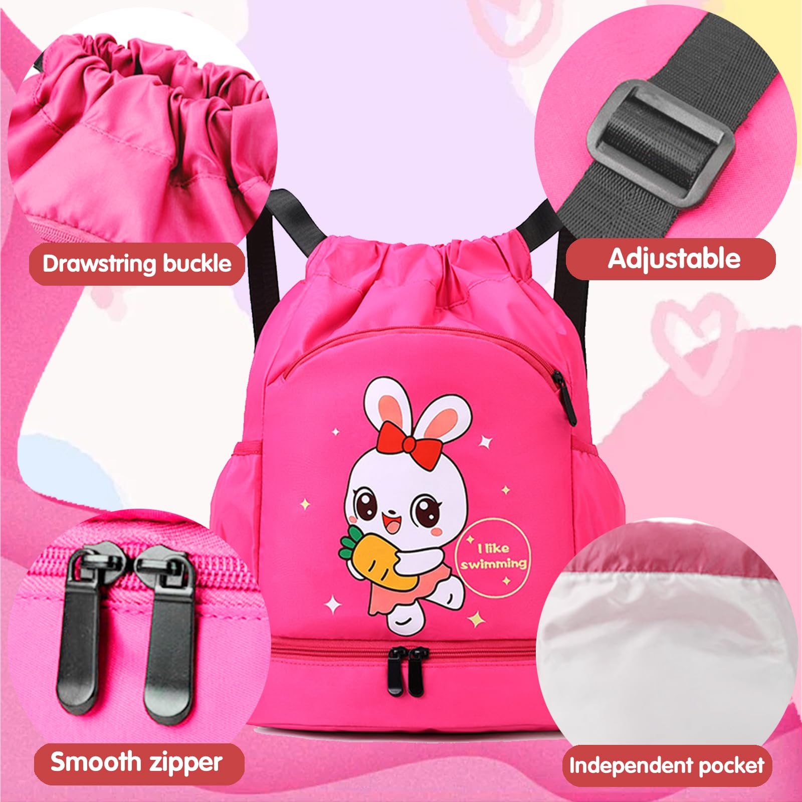 【Impermeabile e durevole】Borsa piscina ragazzino coniglio realizzata in tessuto poliestere impermeabile e di alta qualità di alta qualità per mantenere buone prestazioni anche durante l'usura quotidiana. Basta tirare la chiusura con coulisse per riporre rapidamente gli oggetti e installarli o rimuoverli facilmente