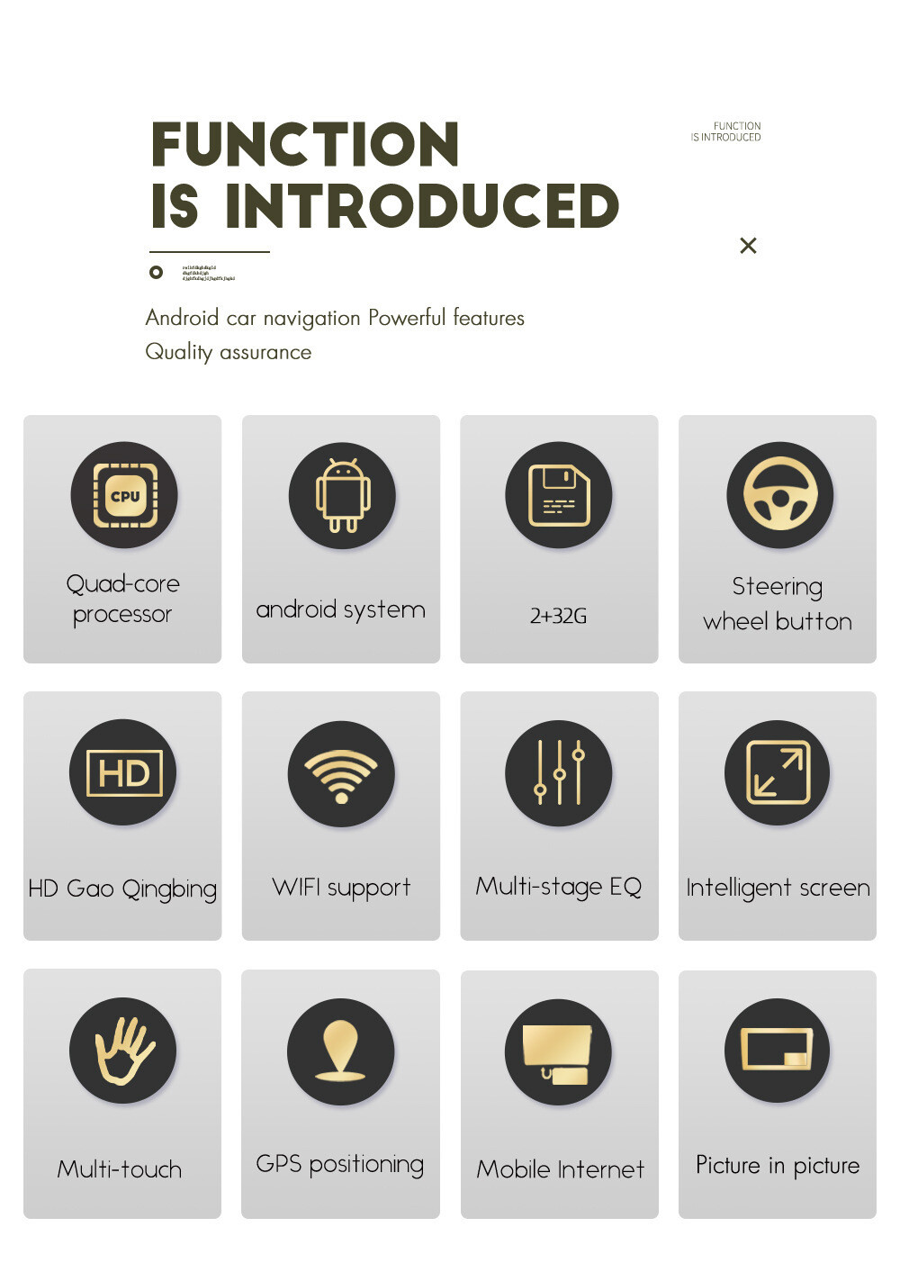 Additional | - Textbook: Could change font, font color, background color, bookmark, reading E-book while listening music - Photo Viewer: Support JPS, BMP, PNG, GIF etc. format. play by revolve, Powerpoint Support 4096*4096 Pixels - Wallpapers: 5 live wallpapers, 17 standard wallpapers, support DIY wallpaper from Gallery - APK Installer: Support Android Package installer - Support Torque Pro(OBD2 &Car): Yes, you can connect a Bluetooth/WIFI OBD2 Scanner Tool(Bluetooth version ≥ 4.2) to use this function - Support Mirror Link function: Yes, support wireless and wired screen mirroring from iPhone and android smartphone - Support TPMS: YES (Not Included) -Support Steering Wheel Control;Yes |