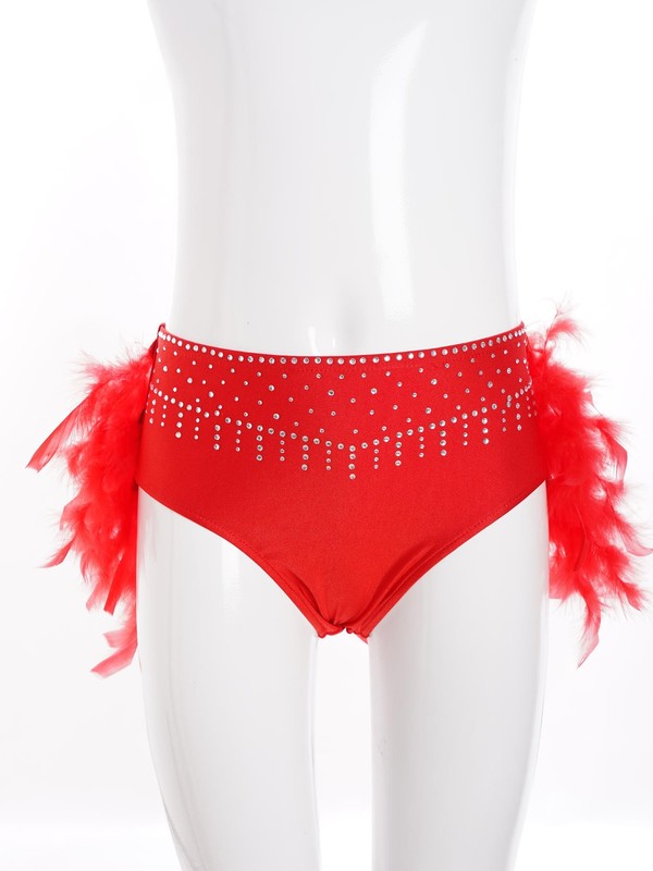 Dance briefs are decorated with sparkling rhinestones on the front and feather on the back to make your girl stand out from the show.