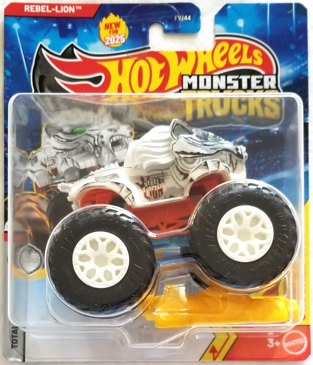 This is a Brand New Hot Wheels - 2025 Monster Trucks Totally Tooned 4/4 Rebel-Lion, 1:64 Scale. It includes a crashed car.
