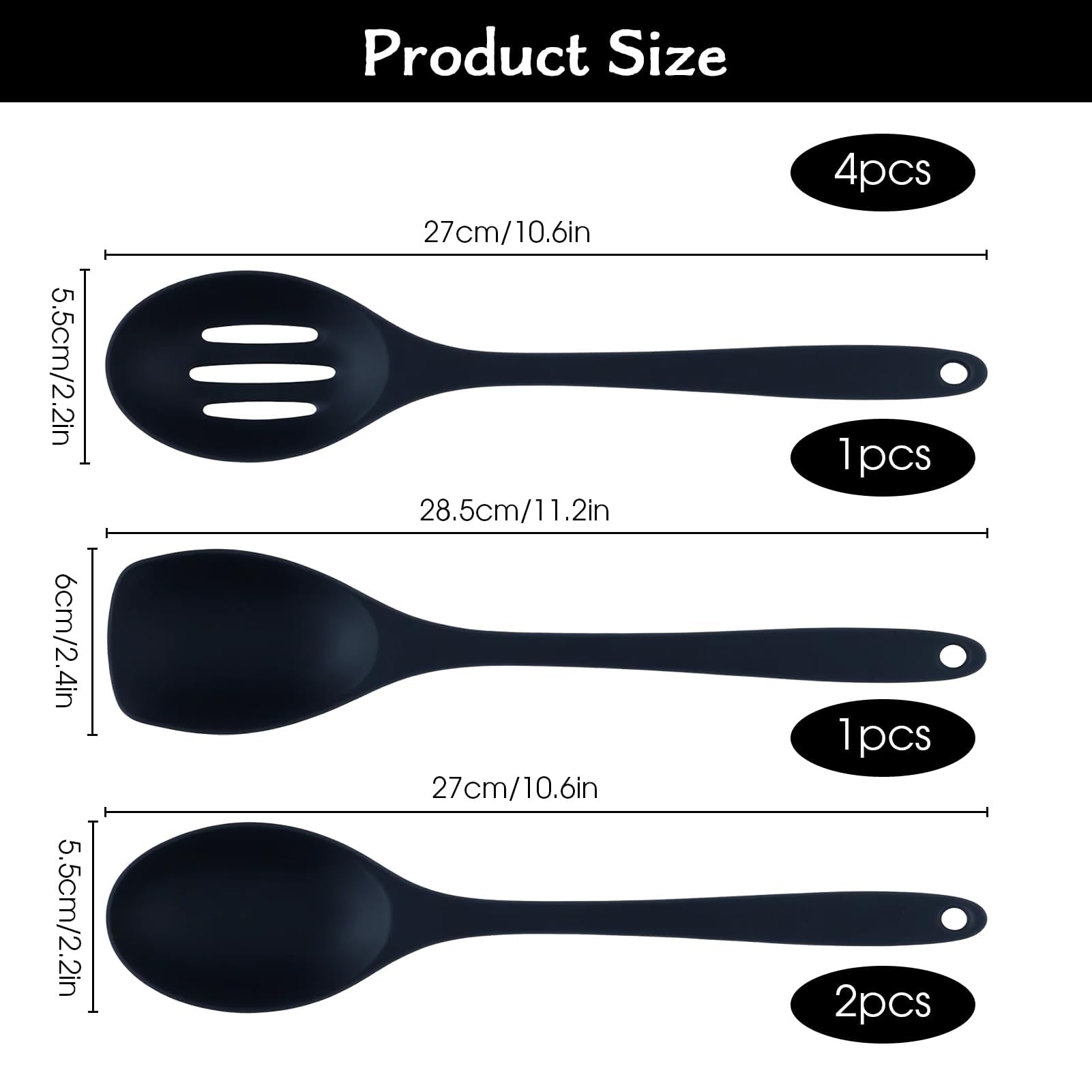 La confezione include: questo set contiene 1 cucchiaio forato, 1 spatola e 2 cucchiai per mescolare, tutti progettati per mescolare. Ogni pezzo misura 27,5 cm di lunghezza e 5,7 cm di larghezza.
