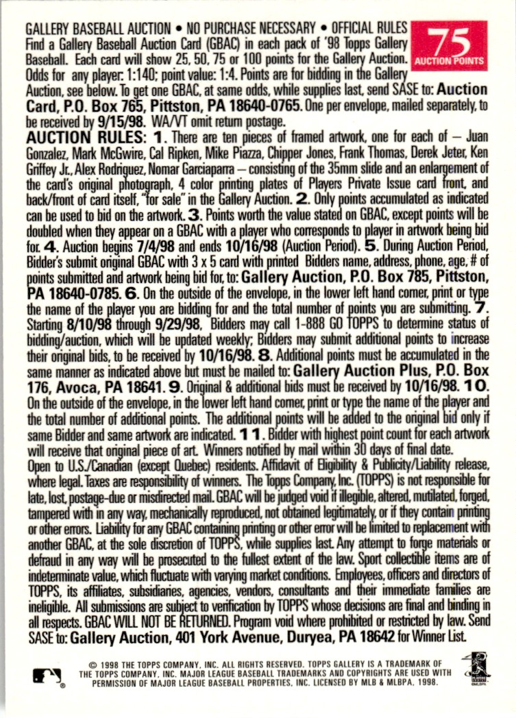 | Description: | Jose Rosado | | Category: | Baseball | | Year: | 1998 | | Product: | Topps Gallery Player's Private Issue Auction Point | | Team: | Kansas City Royals | | Card Number: | 75 | | Dimensions: | 3½" x 2½" | | SKU: | BL BL0020 R03 H (48) |
