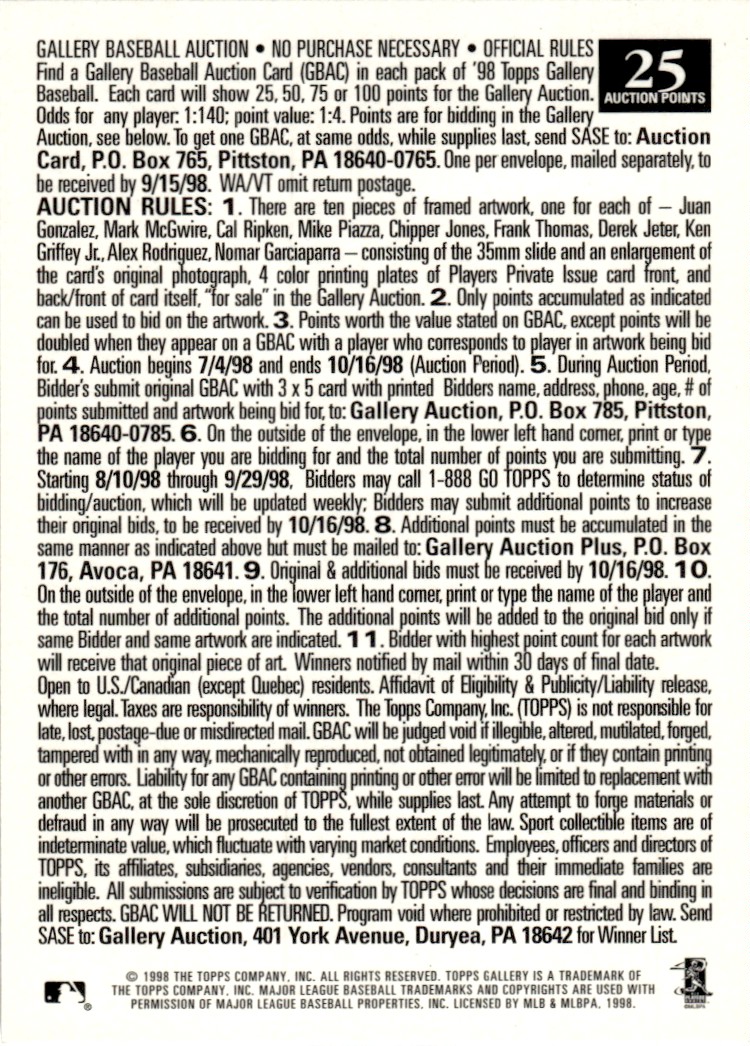 | 1998 Topps Gallery Player's Private Issue Auction Point Mariano Rivera New York |