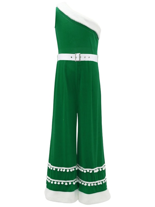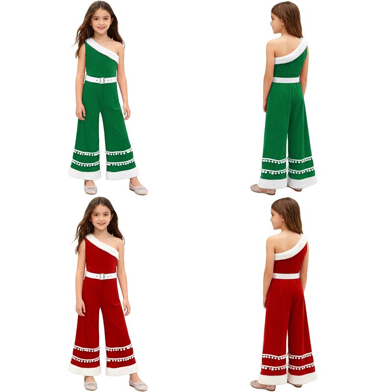 Kids Girls Christmas One Shoulder Long Pants Santa Claus Jumpsuit with Waistbelt