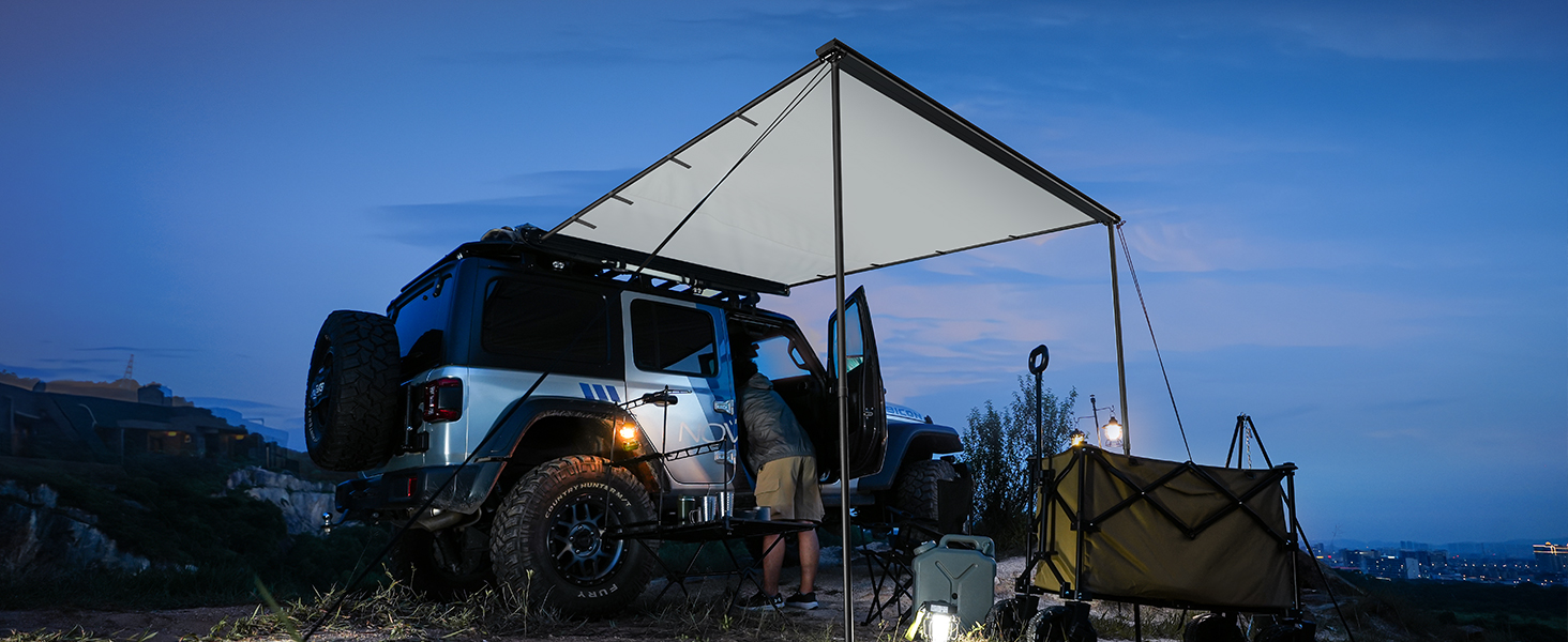 【High Quality】: Our car awning camping is made of 420D Oxford cloth and heavy-duty PVC bag outer cover, with 5000mm PU coating, Providing powerful waterproof function and sun protection, Stable aluminum alloy structure, rust proof, long service life, firmly fixed to the vehicle, not moving due to wind or other external factors, making your outdoor activities comfortable and safe.