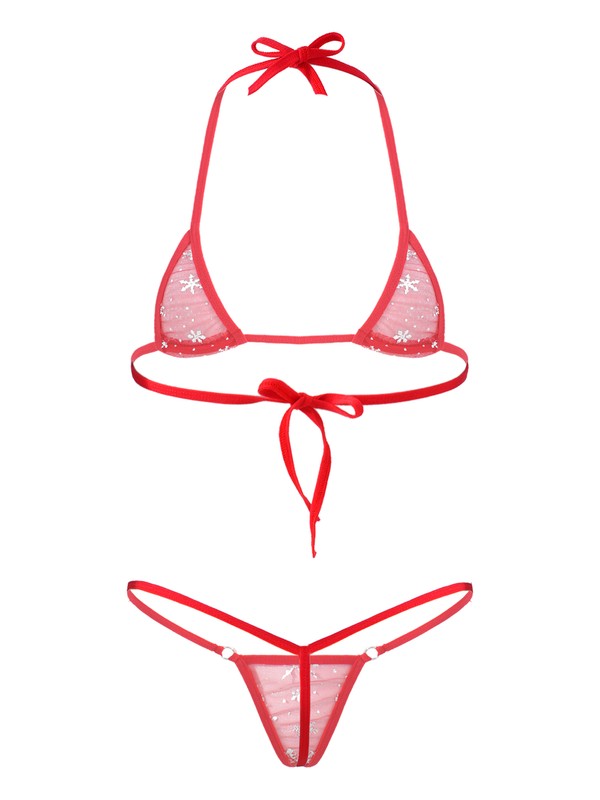 Womens Shiny Snowflake Pattern See-through Mesh Bikini Suit Bra with G-string.