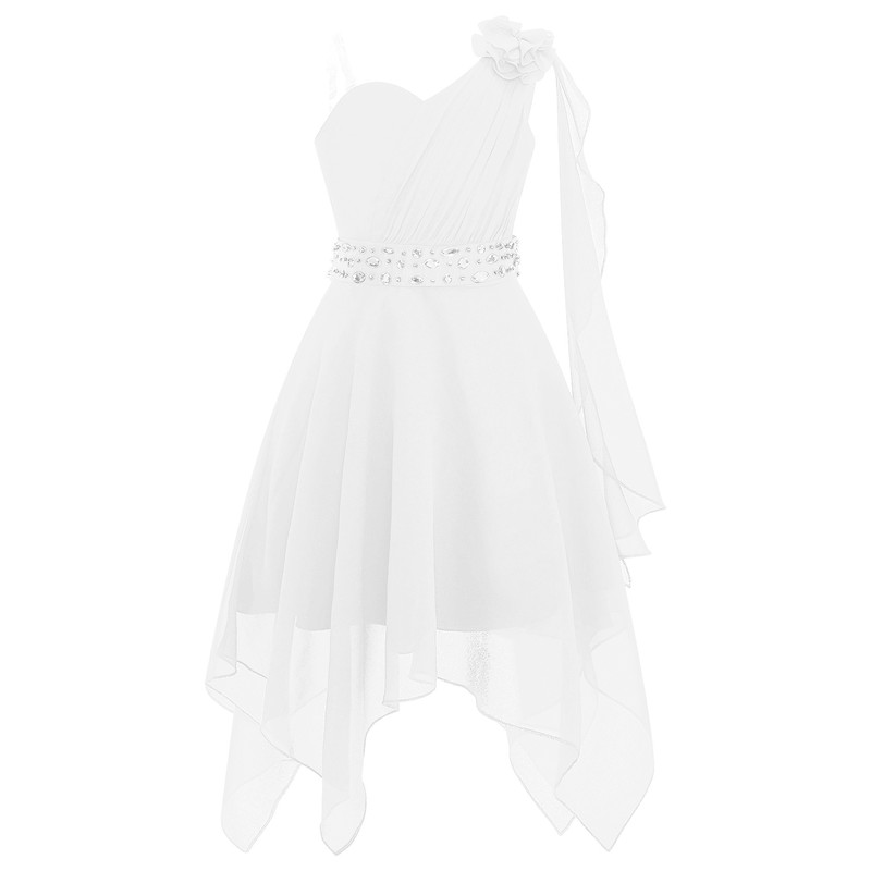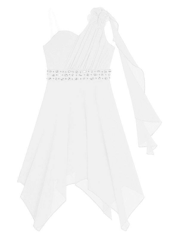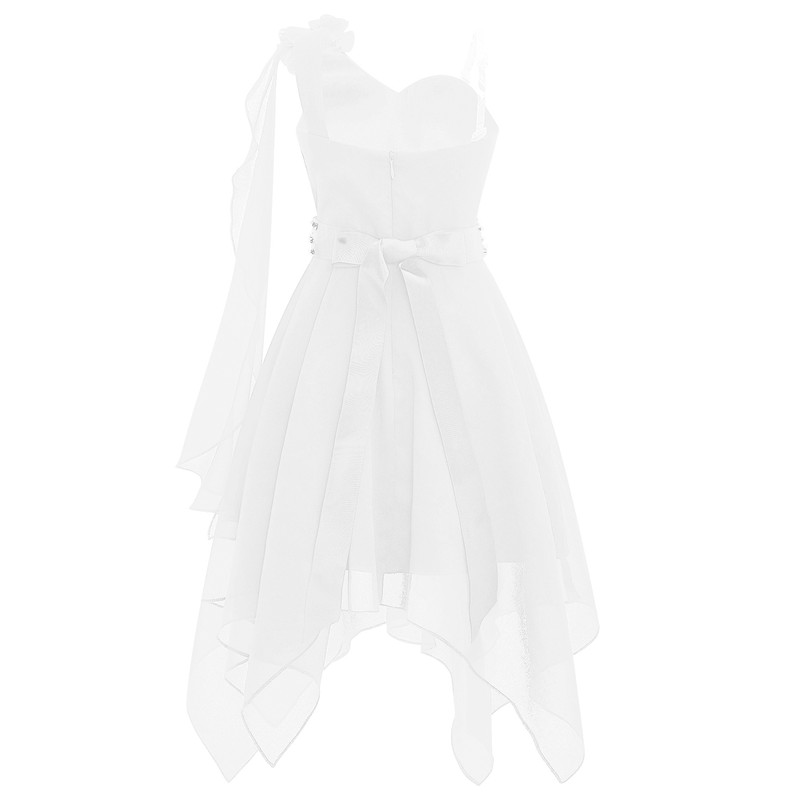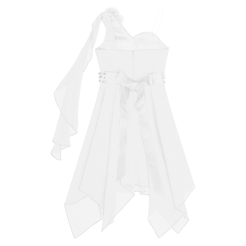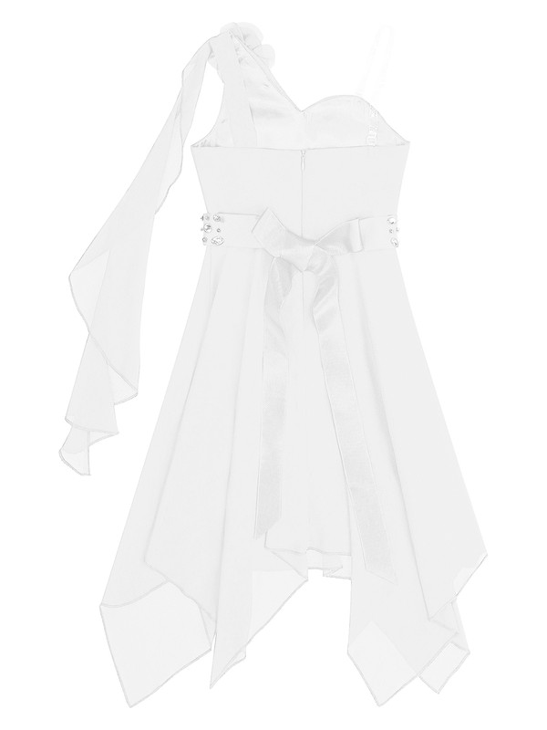 One shoulder design adorned with 3D applique and chiffon ribbon, the other shoulder has detachable transparent straps.