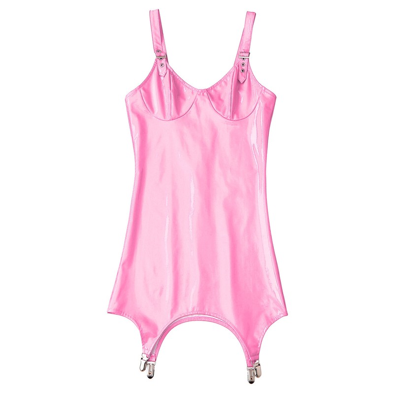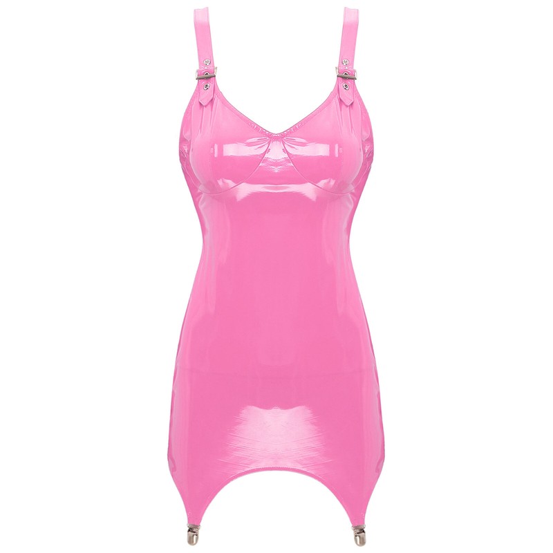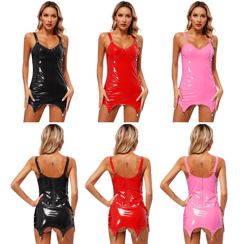 Attached with garter clips for holding stockings. Glossy surface, bringing wet look and enhancing your hourglass figure.
