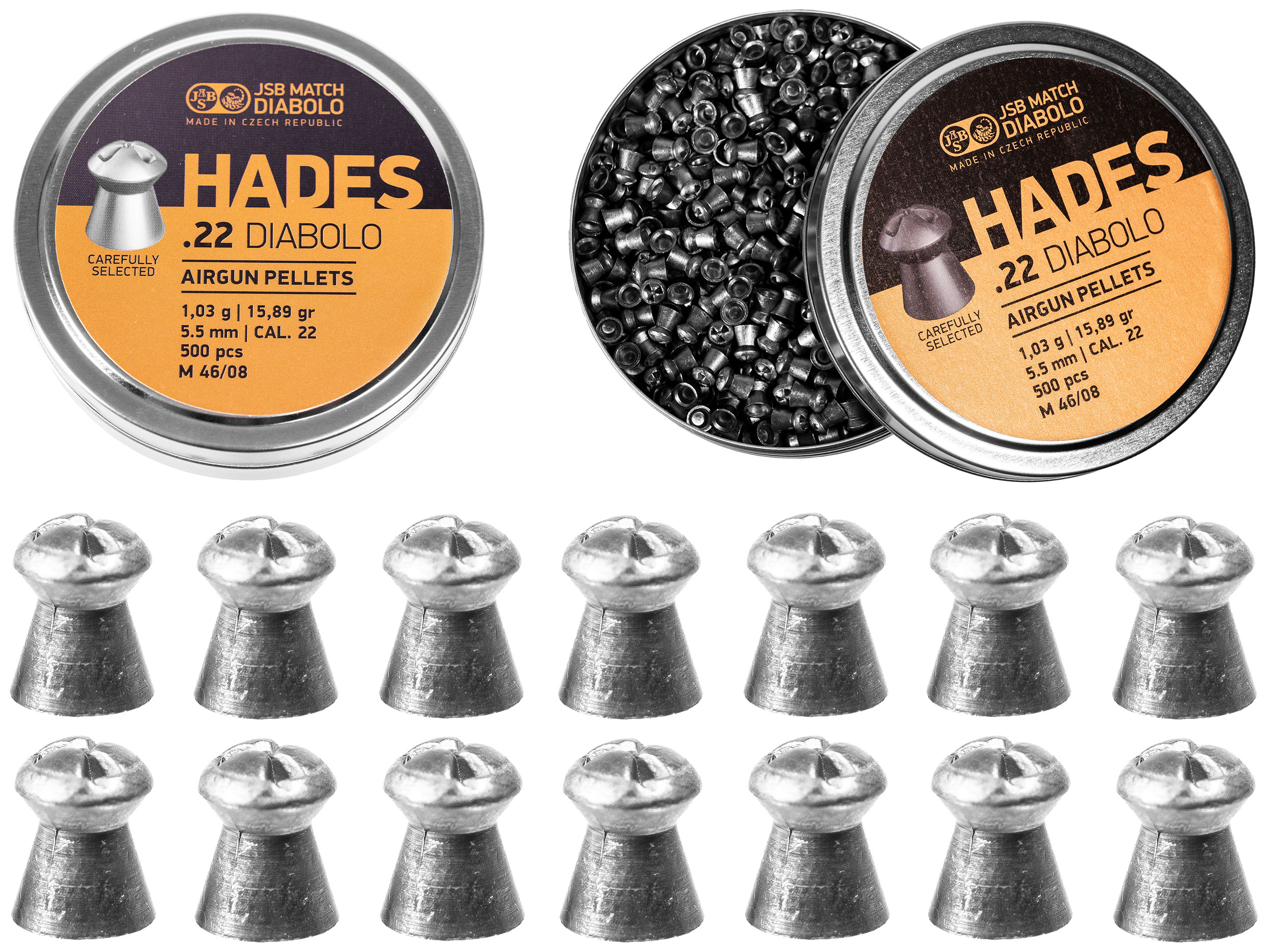 Das JSB Hades 5,5 mm 500 ist ein halbkreisförmiges Hohlspitzgeschoss mit einem charakteristischen dreiarmigen Kopfschnitt, der eine vollständige Abflachung und Freisetzung der vollen Energie im Ziel bewirkt.