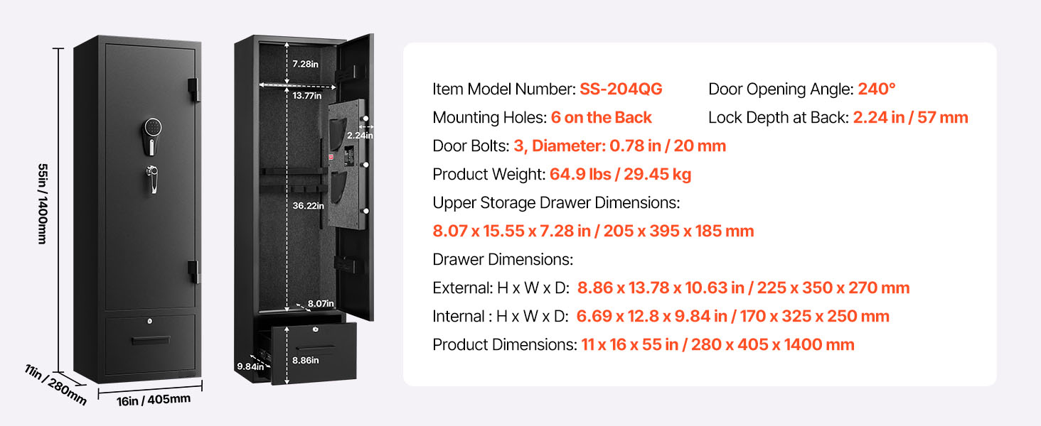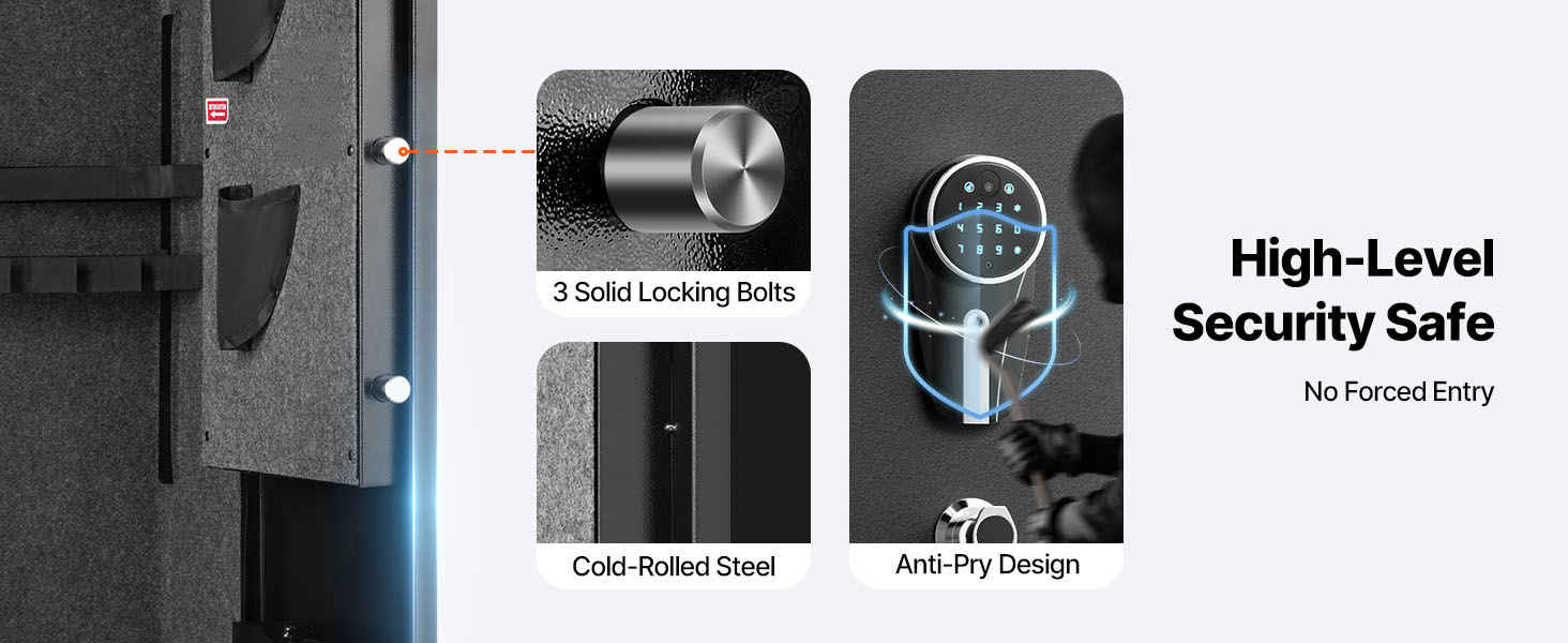 - Sicherer und stabiler Waffenschrank: Der Gewehrschrank besteht aus einer soliden Stahlkonstruktion mit einer 1,1 mm dicken Türplatte, die gegen Einbruch und Beschädigung schützt. Drei robuste Verriegelungsbolzen sorgen für zusätzliche Sicherheit. Vorgefertigte Löcher auf der Rückseite ermöglichen eine einfache Wandmontage.