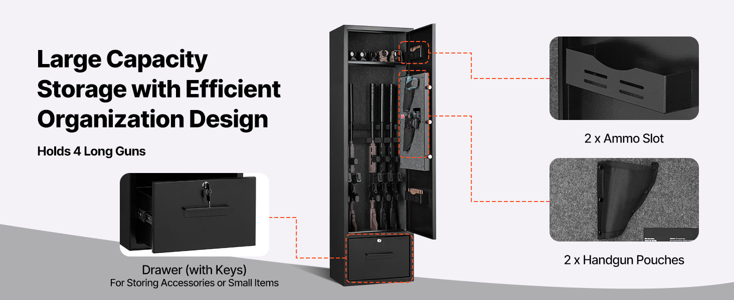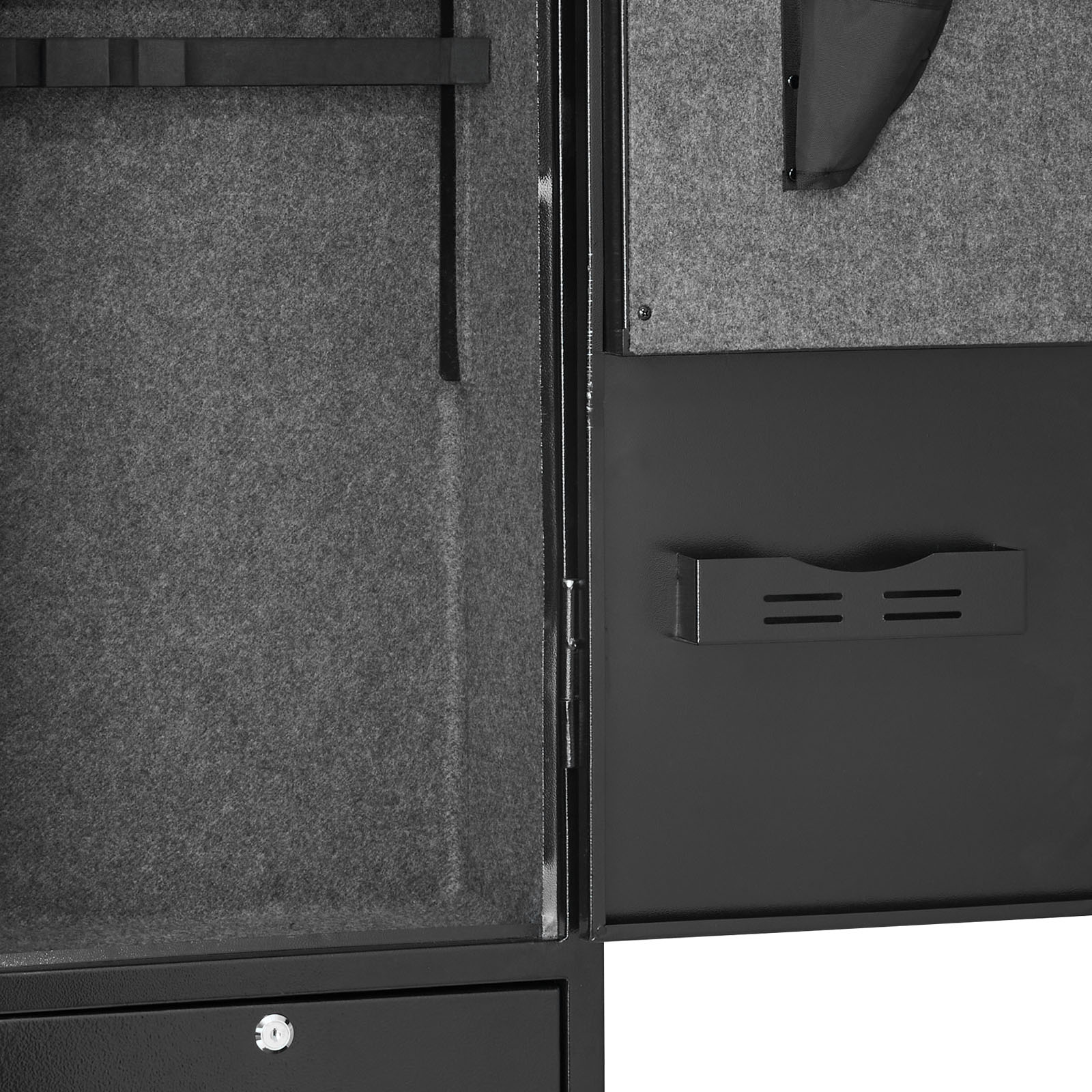 - Geräumiger Waffenschrank: Der Schrank bietet Platz für bis zu vier Gewehre oder Schrotflinten (ohne Zielfernrohre) und ist mit zwei separaten Fächern für Munition sowie verstellbaren Halterungen für Waffen ausgestattet. Zusätzlich verfügt er über eine untere Schublade, die sich ideal zur Aufbewahrung von Zubehör, Munition oder anderen wertvollen Gegenständen eignet.
