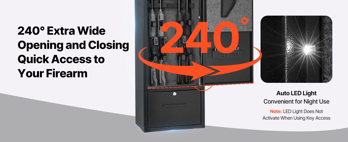 - Bequemer Zugang: Die Tür mit einem 240°-Weitwinkel lässt sich vollständig öffnen, wodurch eine klare Sicht auf alle gelagerten Schusswaffen ermöglicht wird. Im Inneren sorgen integrierte LED-Leuchten für eine gute Sichtbarkeit, selbst bei schwachen Lichtverhältnissen.