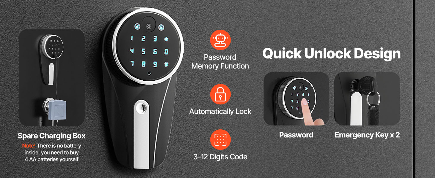 - Sicheres Zugangssystem: Dieses Touchscreen-Passwortschloss mit einer 9-stelligen Eingabe ermöglicht einen schnellen und bequemen Zugang. Die Passwortlänge kann flexibel zwischen 3 und 12 Ziffern gewählt werden. Für zusätzliche Sicherheit sorgt eine automatische Sperrfunktion. Im Lieferumfang sind ein Notschlüssel und eine Ersatzladebox enthalten, die das Entsperren bei leerem Akku erleichtern. (Hinweis: Batterien sind nicht im Lieferumfang enthalten. Es werden 4 AA-Batterien benötigt, die separat erworben werden müssen.)