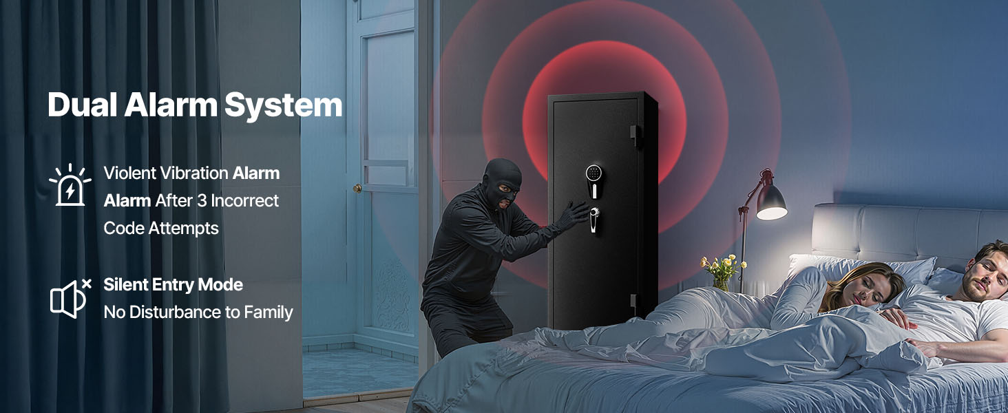 - Sicherheitsalarm & Leiser Modus: Das System aktiviert automatisch einen Alarm, wenn dreimal ein falsches Passwort eingegeben wird oder der Waffenschrank manipuliert wird. Der leise Modus kann durch die Eingabe von 11# eingeschaltet werden, sodass Sie auch nachts oder in sensiblen Situationen ungestört Zugang zu Ihren Waffen haben.
