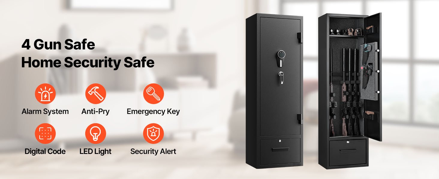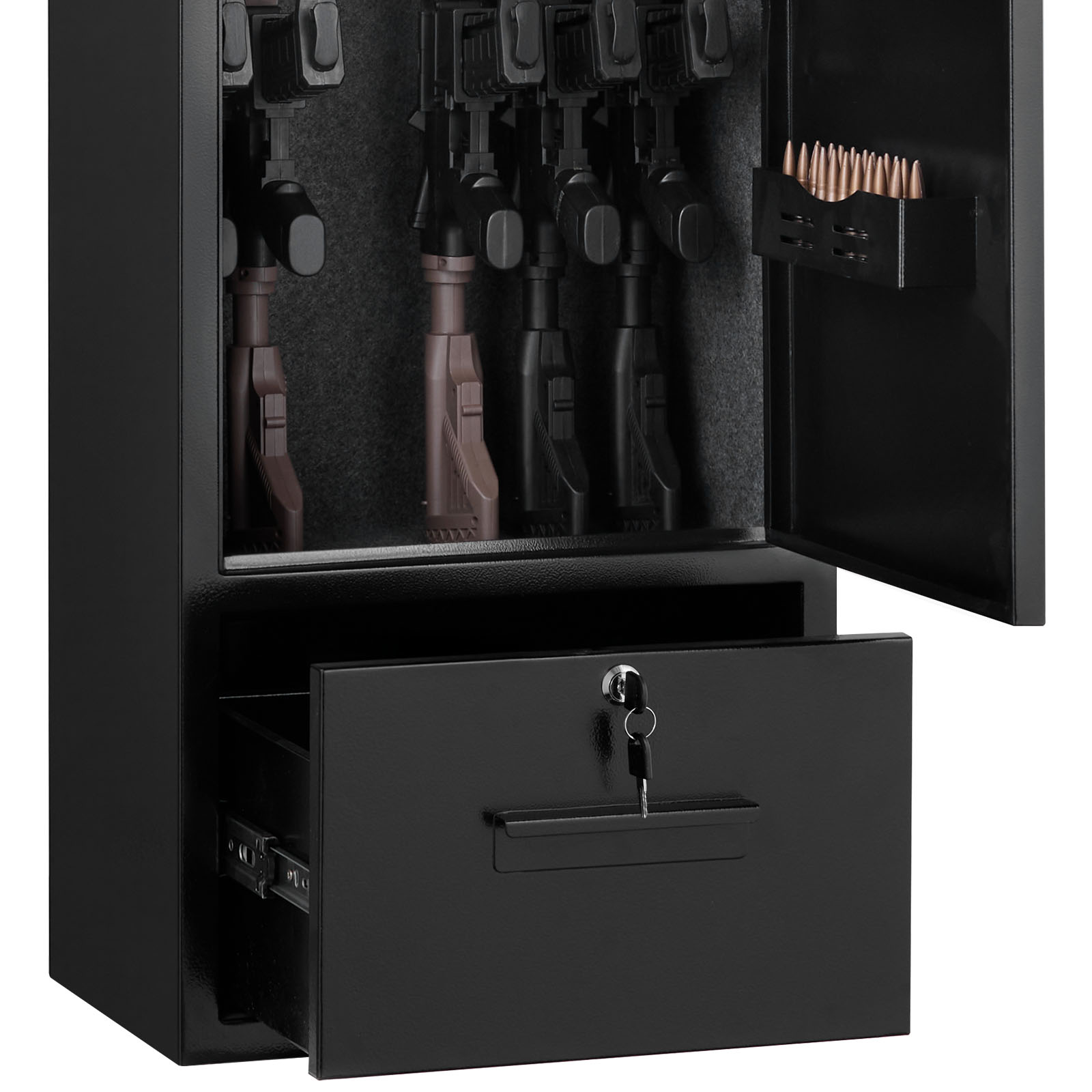 Dieser Waffenschrank bietet Platz für bis zu vier Langwaffen und ist mit einem versteckten Fach ausgestattet, das sich ideal zur sicheren Aufbewahrung von Munition und Zubehör eignet. Er erfüllt die Anforderungen von Waffenbesitzern und Sammlern, die mehrere Schusswaffen lagern möchten. Zusätzlich verfügt der Schrank über anpassbare Halterungen, die für Gewehre unterschiedlicher Länge geeignet sind.