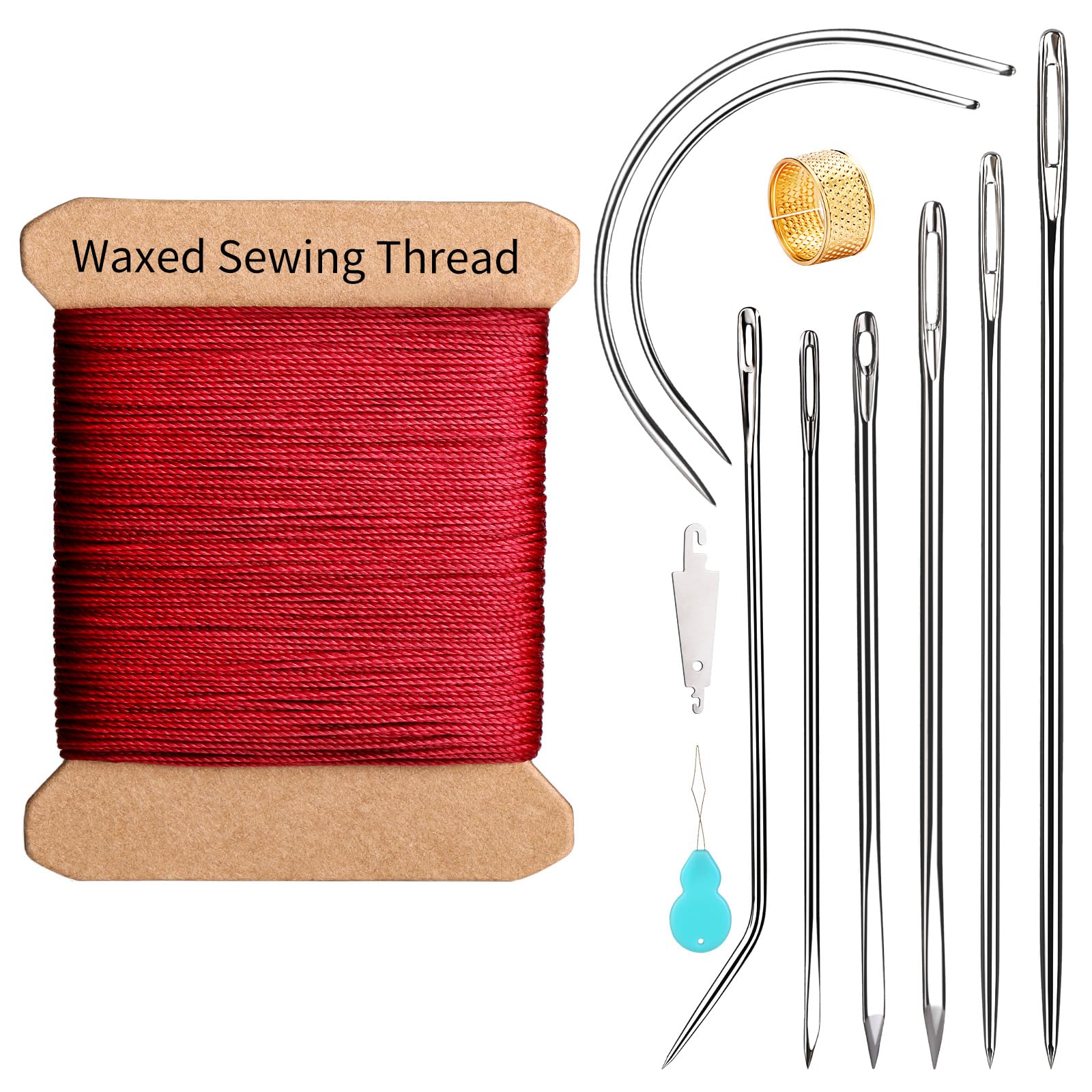 Leather Needle and Waxed Thread Kit: Upholstery repair kit include 1 rolls 32 yards waxed threads and 8 heavy-duty needles (long upholstery needles, curved needles, j-shaped, triangle leather stitching needle, sail needle), thimbles, threaders. Useful for both beginners and professionals, sufficiently long wax thread and a sufficient number of needles can complete most leather projects