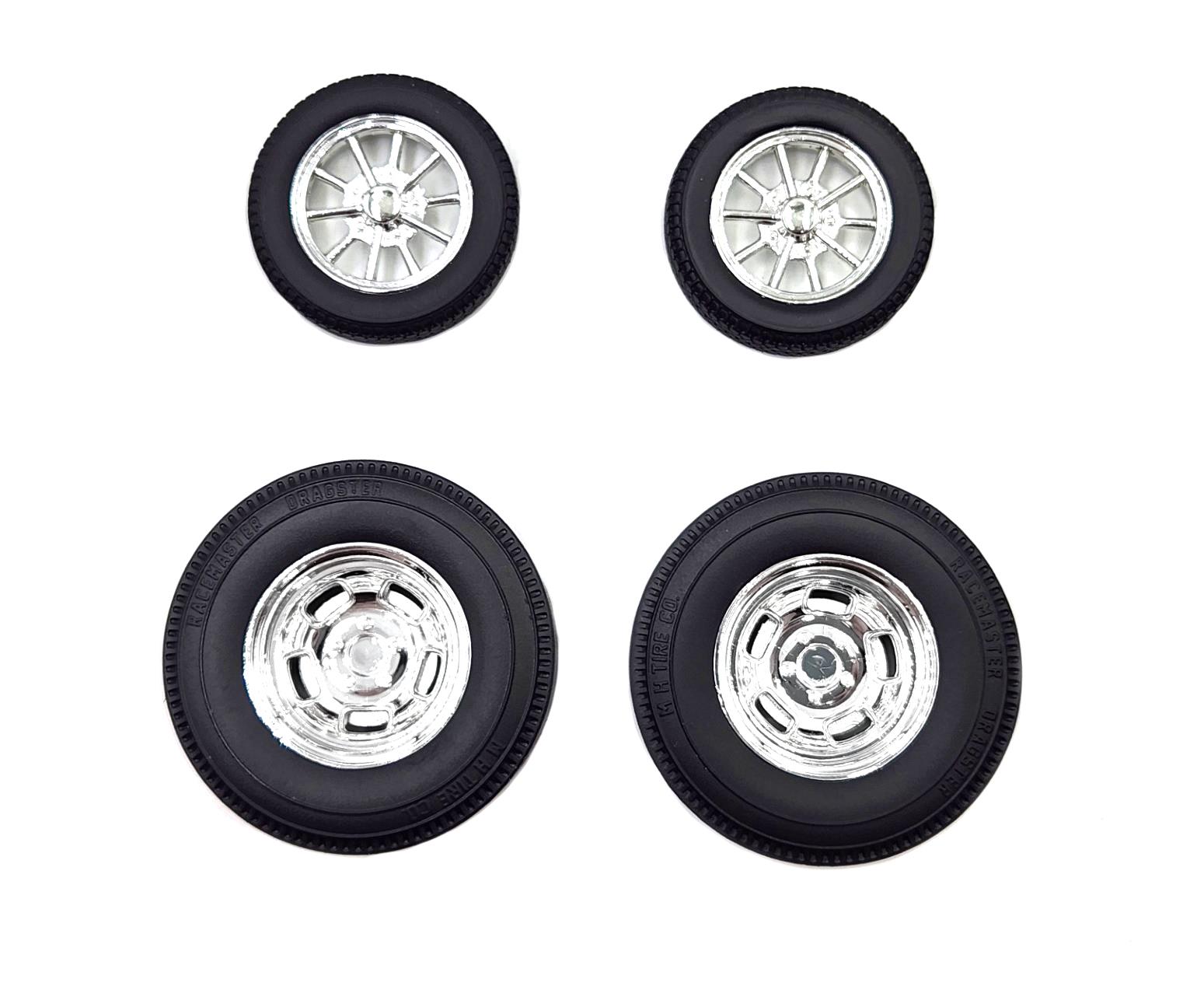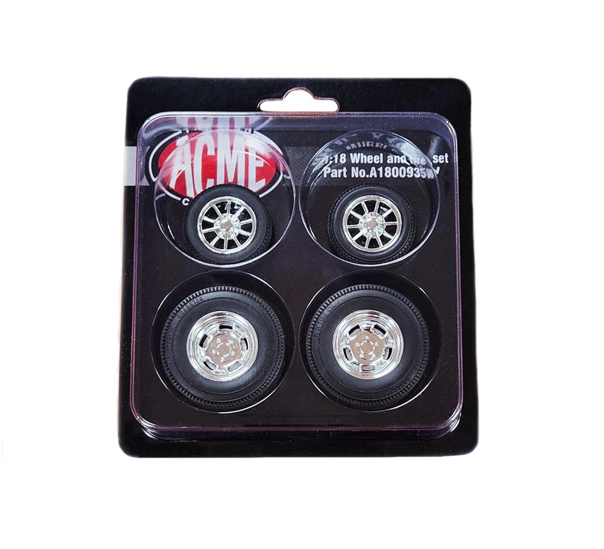 Acme 1:18 Scale Drag Wheel & Tire Set. Take your 1:18 scale model car to the next level with this high-quality accessory set. Crafted out of real rubber for those who demand precision and authenticity in their diecast builds, the A1800935W Drag Wheel & Tire Set delivers outstanding realism and display appeal.