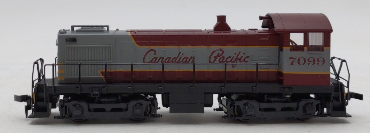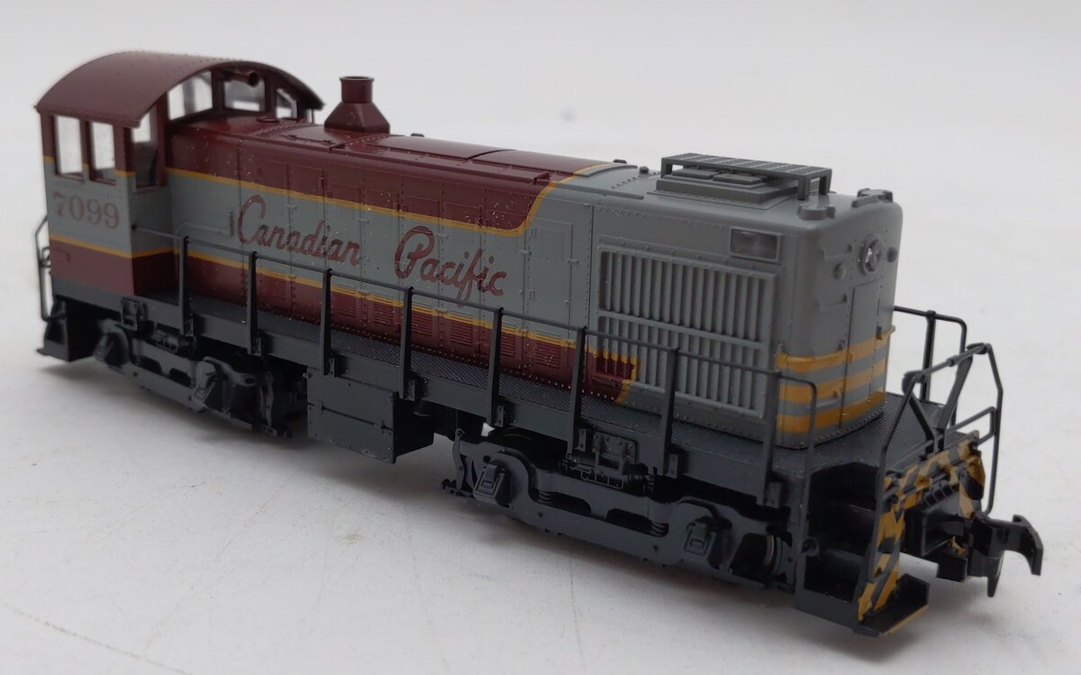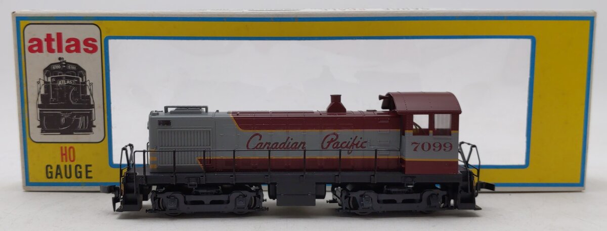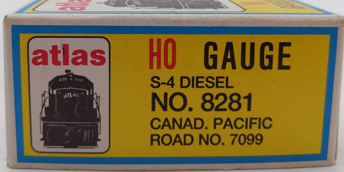 Here is an Atlas 8281 HO Canadian Pacific S4 Diesel Switcher Locomotive #7099. Features include 5-pole skewed armature motor for reliable operation, Dual-flywheels for maximum performance at all speeds, Horn Hook Couplers, Exceptional painting and printing, and Sturdy die-cast mainframe and gear cases.