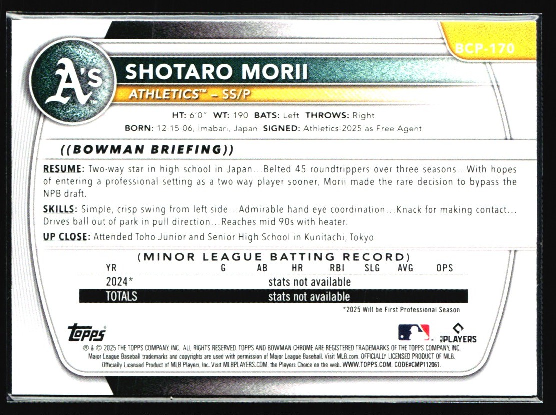 2025 Bowman Chrome Shotaro Morii Rookie Oakland Athletics #170