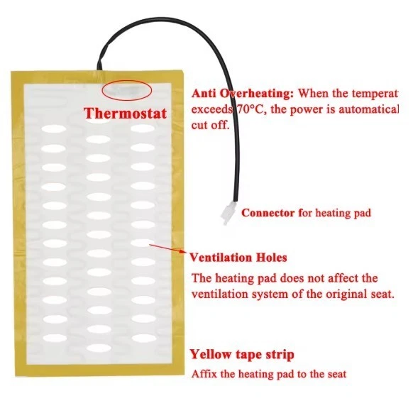 Features: A comfortable necessary for driving in winter. DC 12V Dual Seat Control Switch Systems, designed to be installed between the seat cover and cushion. Fit 2 seats, 2pcs heated pads for 1 seat: 1pc on back and 1pc on the bottom. With sticker, easy to install. Using a heating pad that can reduce air conditioning open, not only fuel-efficient can also relieve the air conditioning hot, relieve driving fatigue.
