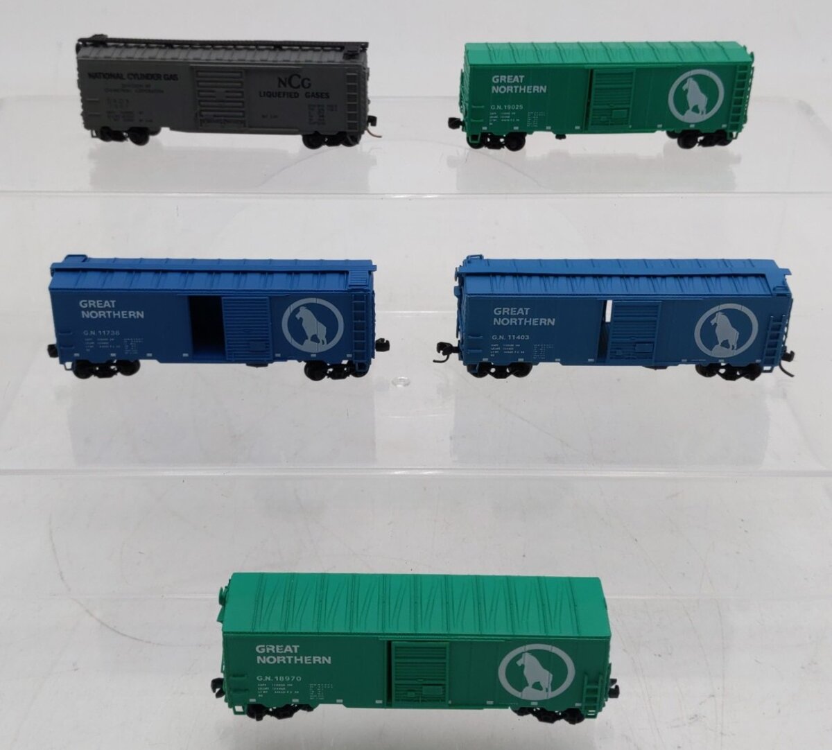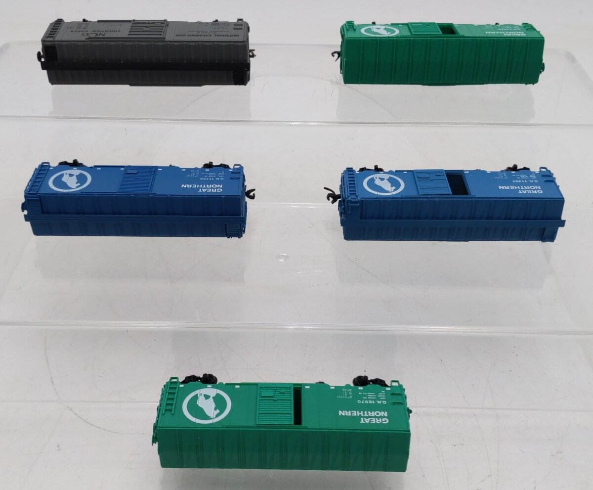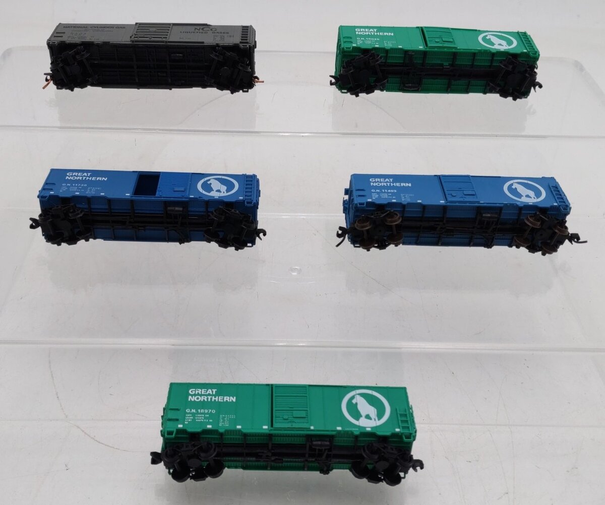 Here is an assortment of Intermountain/Trix N Scale Box Cars #1007,11403,11738,18970,19025 [5]. Features include plastic construction, plastic trucks, plastic wheels and axles, and knuckle couplers.