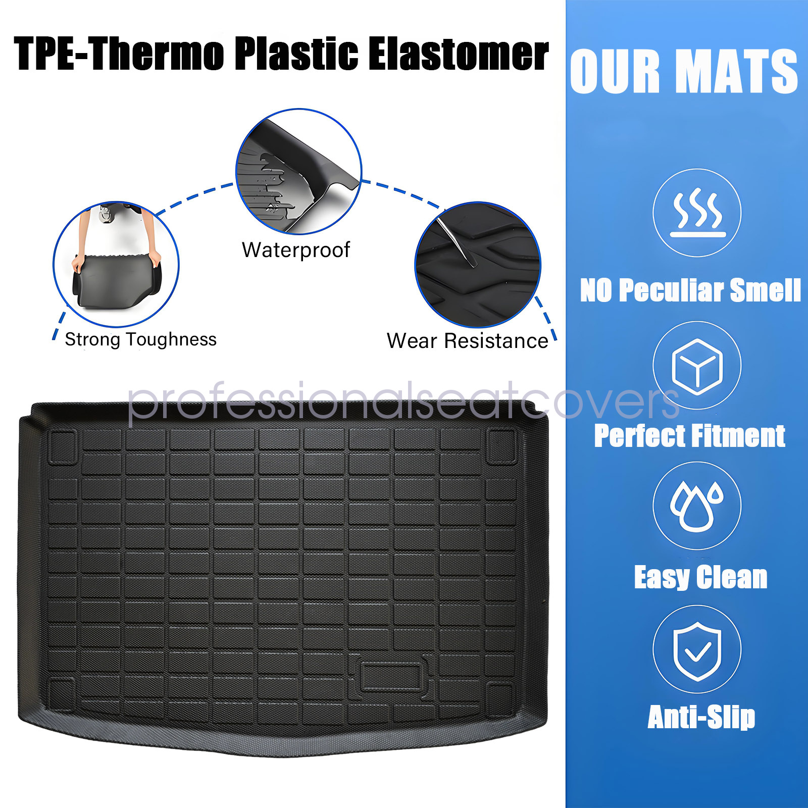 Soillar floor mats use elastic TPE (Thermoplastic Elastomer), No foul odor is produced even at high temperatures. soft touch and exquisite finish. This floor mats are skid-proof and recyclable.