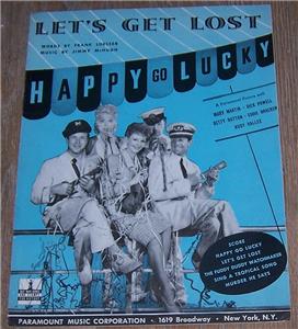Let's Get Lost Sung by Mary Martin in Happy Go Lucky. A Paramount Picture with Dick Powell, Betty Hutton, Eddie Bracken, and Rudy Vallee. Words by Frank Loesser and Music by Jimmy McHugh. 1943 Paramount Music Corporation. Sheet music is in good condition, wear at edges