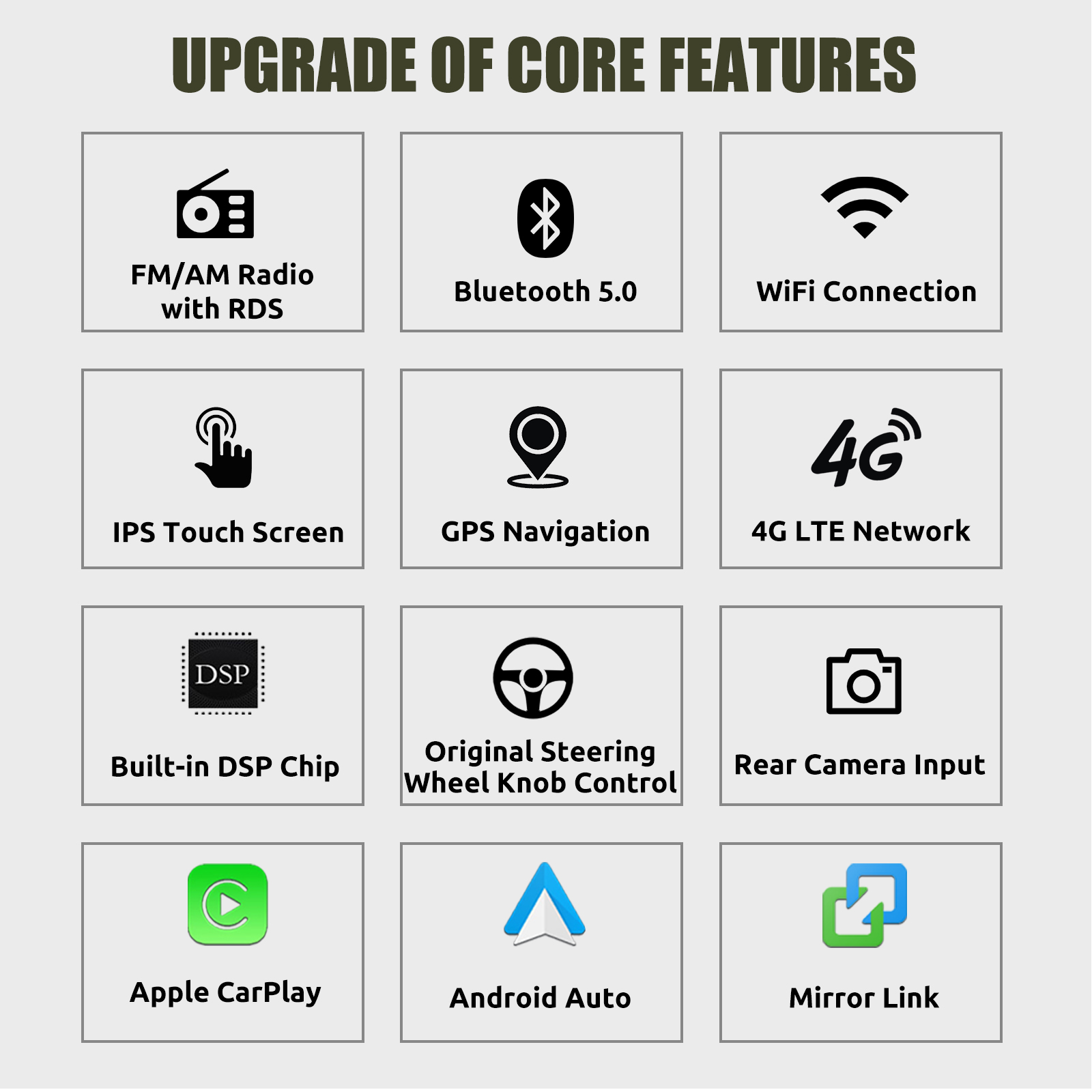 FM/AM/RDS radio, Bluetooth, and DSP sound: Supports Bluetooth 5.0, with built-in microphone, allowing you to make hands-free calls while driving. Supports access to the phonebook, music playback interface, etc. Supports RDS. You can store 18 FM and 12 AM radio stations. Built-in DSP chip. Supports 48-band EQ adjustment. With the DSP function, you can individually adjust the sound of each speaker using various equalization methods: jazz, rock, pop, classical, etc., to achieve an exceptional listening experience tailored to your personal preferences. 4 x 45W amplifier, surround sound, and subwoofer output.