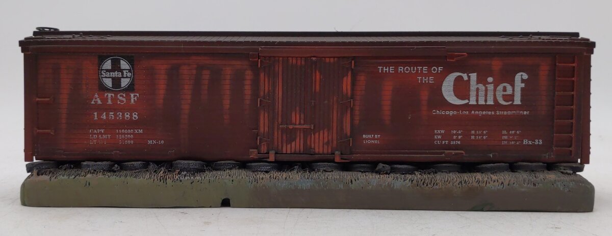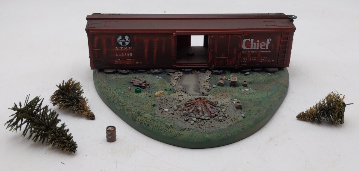 Here is a Lionel 6-14080 O Gauge Operating Hobo Hotel. It is set in the old west, camped in front of a long-abandoned Santa Fe reefer, a group of hobos pass the night away in front of their fire. A hot meal simmers over the open flame. The hobos are playing a checkers game in front of the tall pine trees. This Hobo Hotel has the following features: Realistic decoration, Seven solid cast pewter figures, Detailed molded base, an Actual Lionel reefer body, Two bright, flickering LEDs illuminate the fire, Three pine trees, and the Trash can doubles as on/off switch.