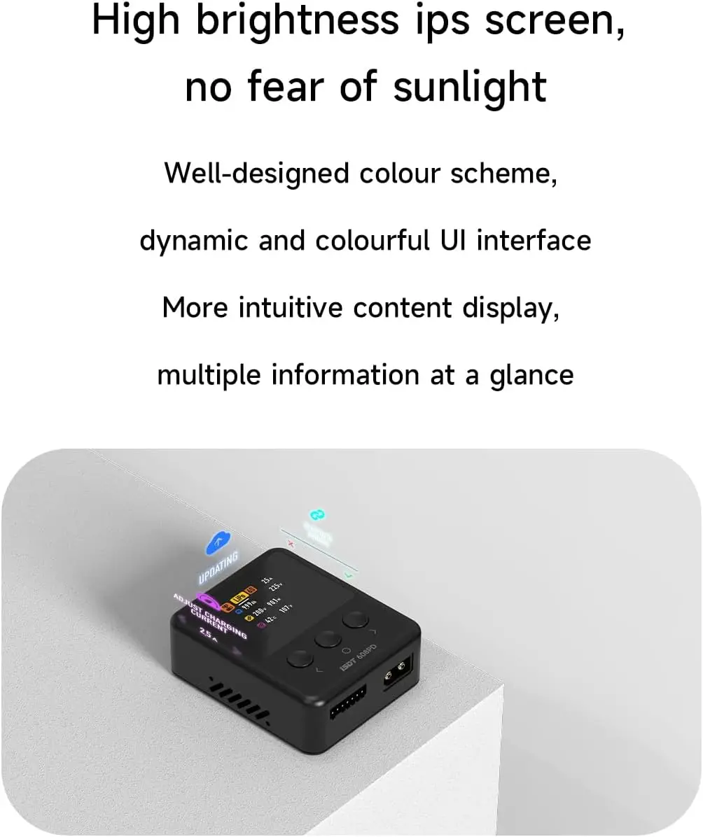 【IPS Screen:Low power consumption】 The lipo balance charger with a 1.5” IPS screen, auto-brightness adjustable, 178°visible angle,display clear and distinct even in varies hard environment or angles as well as in strong sunshine, reduce light damage to user’s eyes.