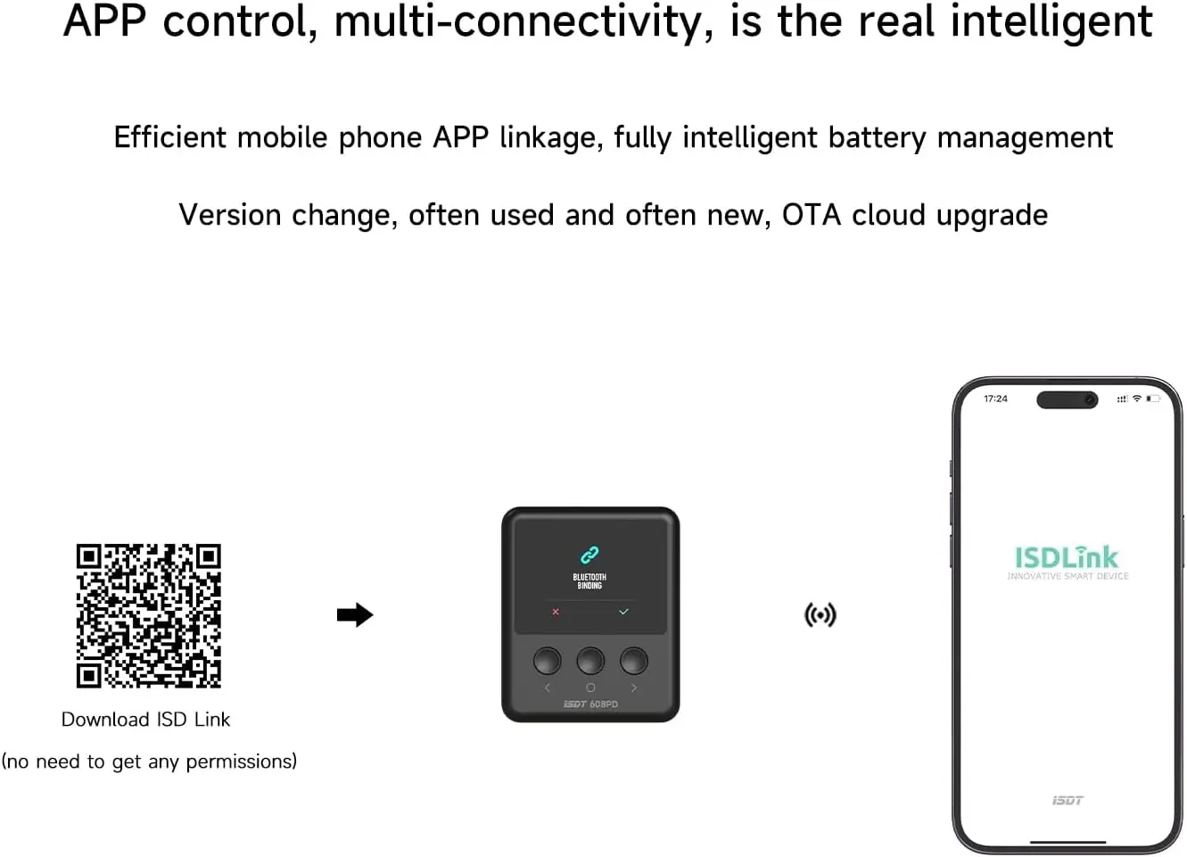 【Support "ISDLink" APP Remote Control 】In APP, you can perform an OTA upgrade of your lipo charger, preset charging tasks, monitor the charging process at any time. Wirelessly operate, awesomely simple. Besides, you also can upgrade the charger on PC by USB port.