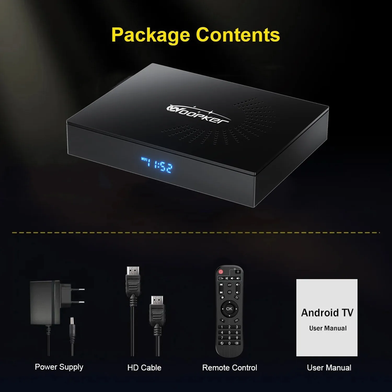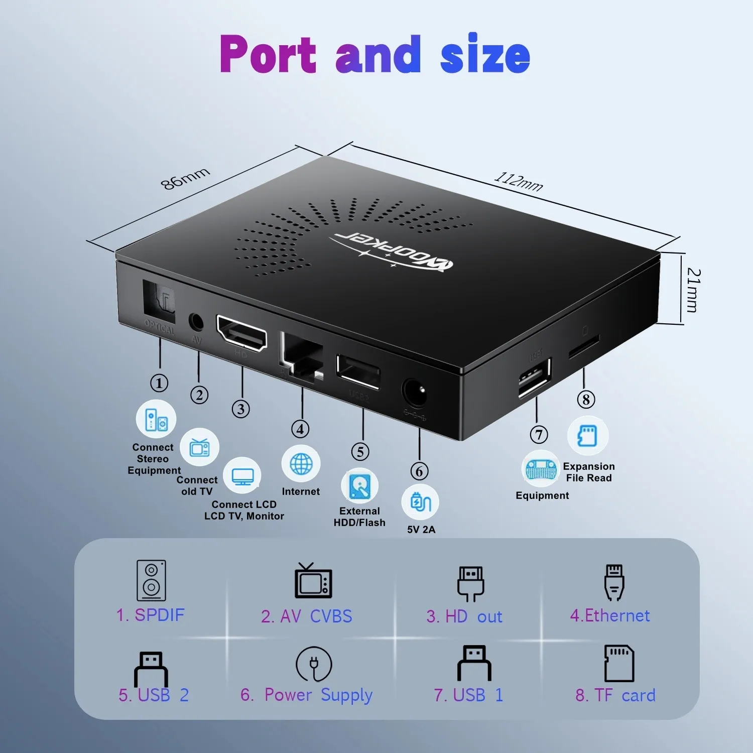 1, Amlogic S905W2 Quad Core ARM Contex A35; 2, GPU: ARM G31 MP2, Supports OpenGL ES 1.1/2.0 and OpenVG 1.1; 3, OS: Android 14.0; 4, Storage: DDR3 2GB/4GB, eMMC 16/32/64/128GB ; 5, Support: Firmware Wireless Upgrade(OTA); 6, Support Multi-Functions Including: - 4K@60fps, AV1, HDR10+, H.265; - 10/100M RJ45, 2.4G/5G Dual WiFi, BT5.0+; - Connect to your TV via HDMI 2.0 for a seamless viewing experience. - KW2 ATV gives you a smarter, easier way to get more from your TV! - Google Voice Remote :Control your TV box with ease using the Voice Control (You need to purchase a separate voice remote control) A: 2G+16G+Dual Wifi+BT5.0+100M B:4G+32G+Dual Wifi+BT5.0+100M C:4G+64G+Dual Wifi+BT5.0+100M - 1 x KW2 TV Box - 1 x Remote control - 1 x Power Supply - 1 x HD Cable - 1 x User ManualFeature: