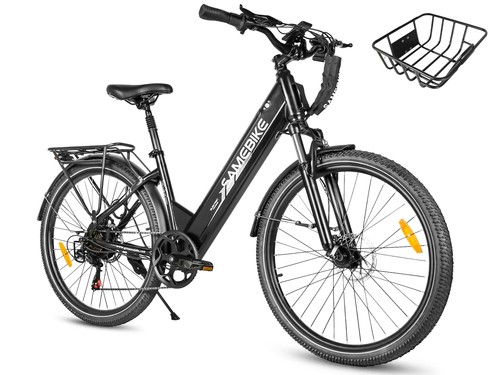 This electric bicycle features a spacious front basket for easy errands. It offers a frame with adjustable handlebars and seat height. The 26-inch tires offer excellent cushioning for off-road riding.while their tread is also suitable for different road conditions.